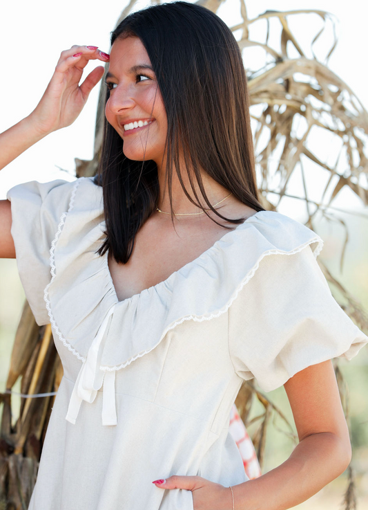 Linen Ruffle Collar Dress w/ Tie