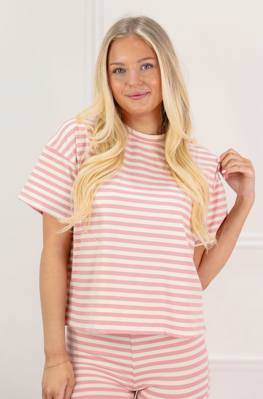 Ribbed Striped T-Shirt and Pants Set of 2 Pink