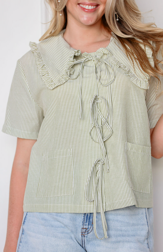 Big Collar Stripe Ties Top Olive
