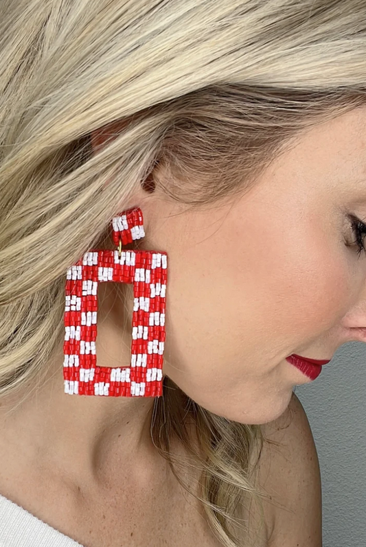Red Checkered Beaded Earrings