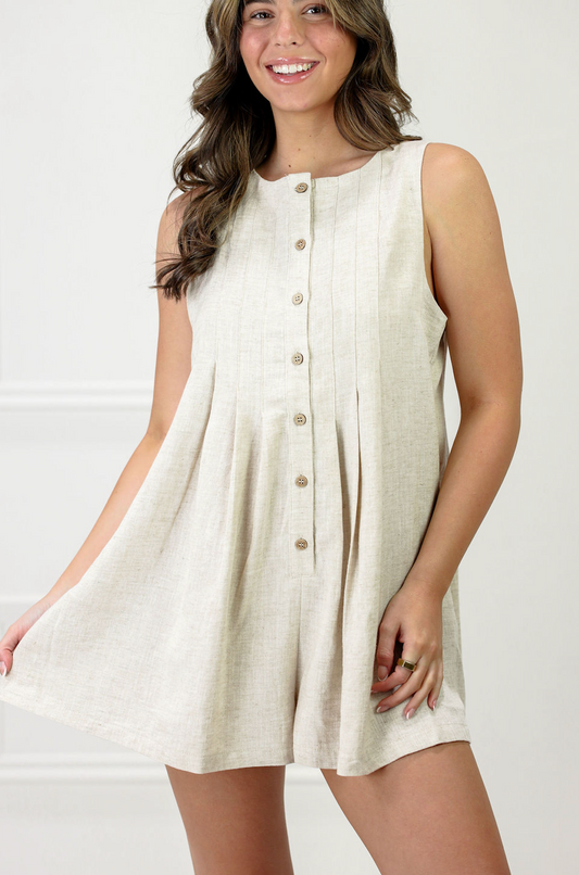 Linen Pleated Front Button Romper Oatmeal