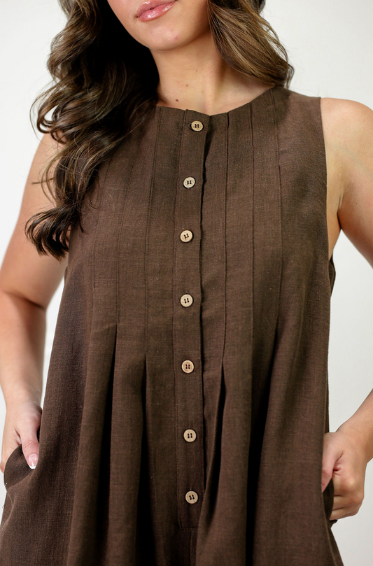 Linen Pleated Front Button Romper Brown