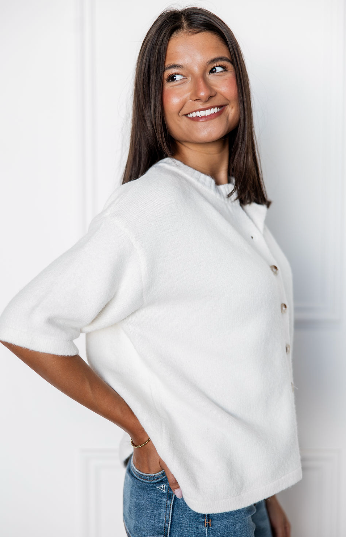 Ivory knit sweater with a button-up front, ribbed trim, and a classic, cozy silhouette.