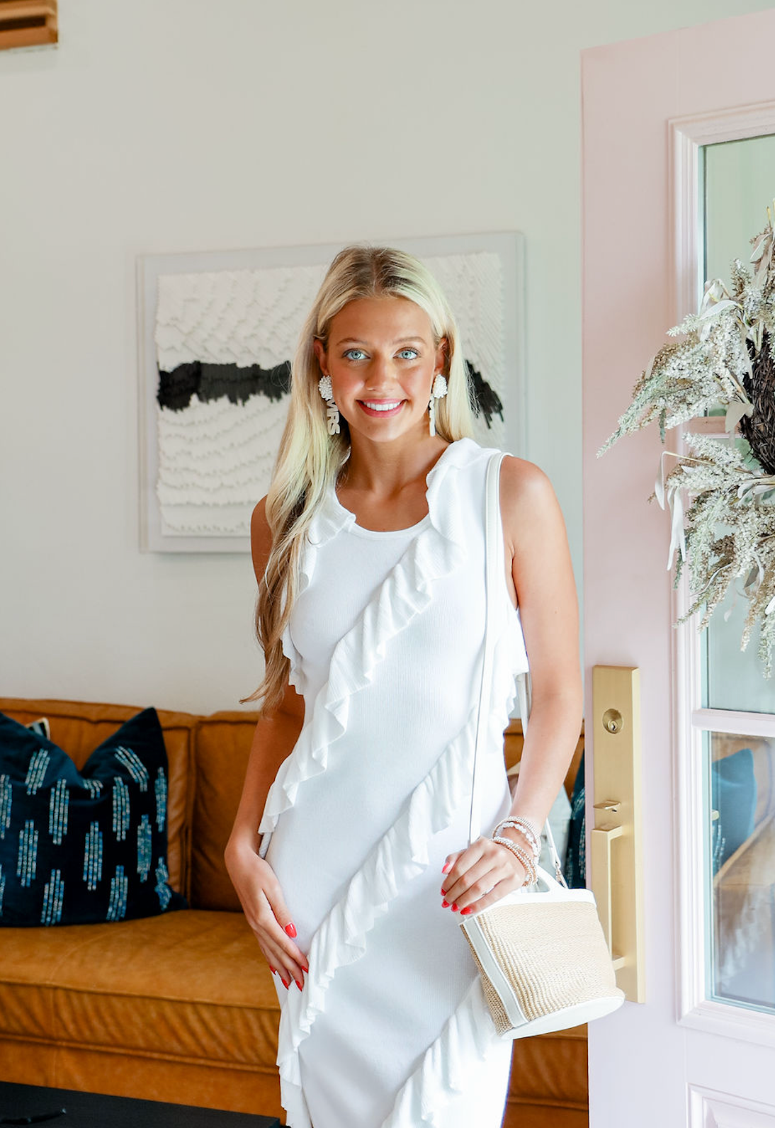 The Asymmetrical Ruffle Midi Dress in White is a sleek and modern bridal moment with a playful twist. This curve-hugging midi features a scoop neckline and dramatic ruffle trim that cascades diagonally down the front and around the hem for eye-catching movement. Its a perfect pick for bachelorette parties, bridal dinners, or the dance floor.