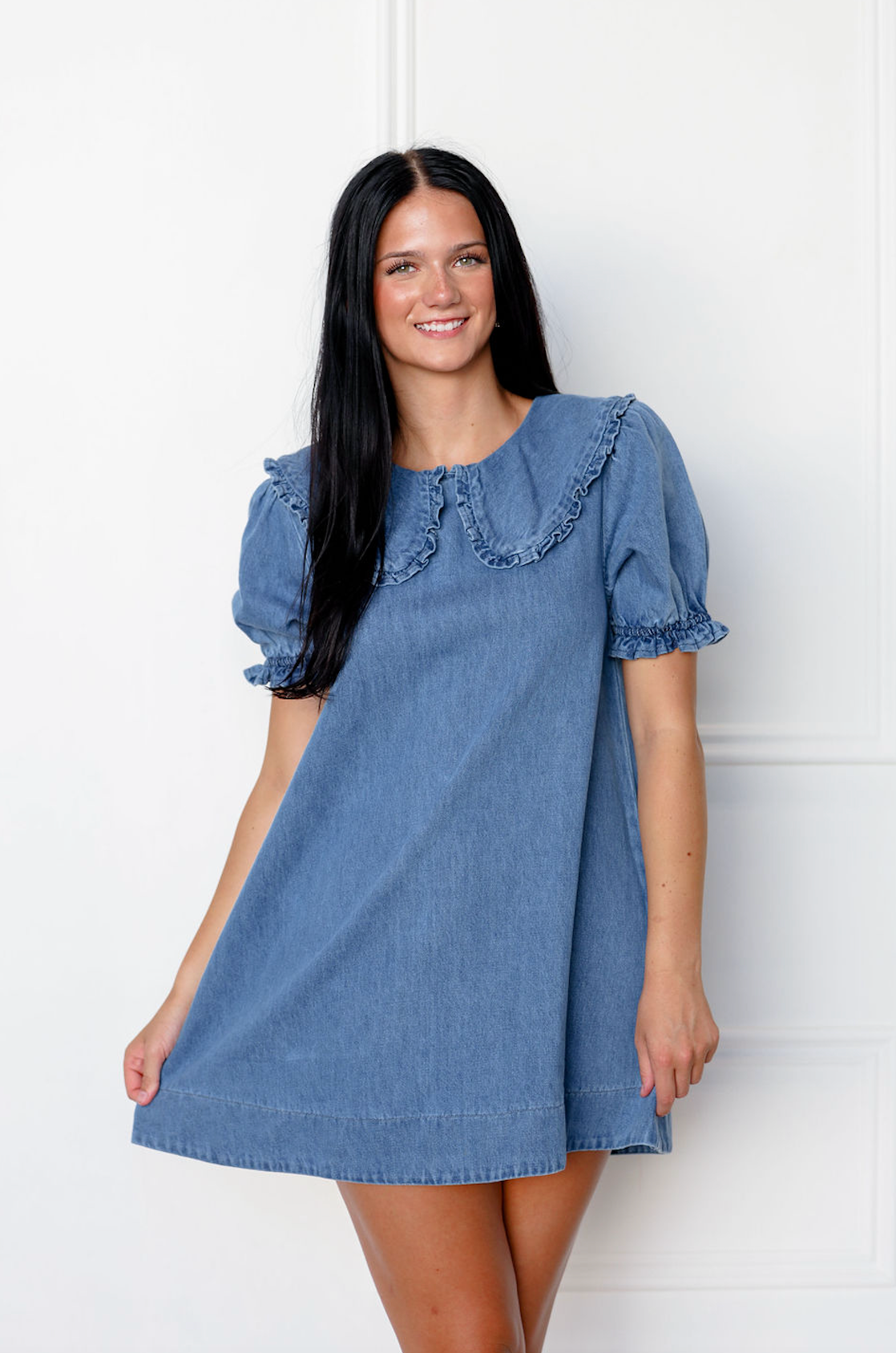 This big collar denim dress features a statement ruffle collar, button-down front, and a relaxed A-line silhouette. Cute, classic, and easy to style from day to night.