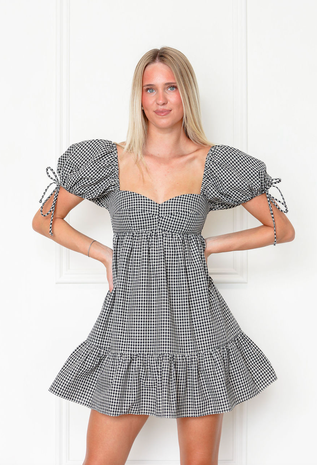 Black and white checkered babydoll dress featuring a square neckline, gathered puff sleeves, and a tiered skirt for an effortlessly sweet and playful silhouette.