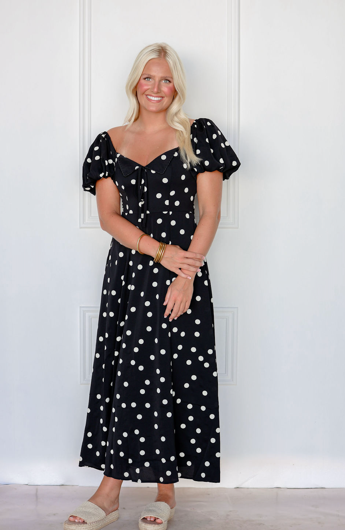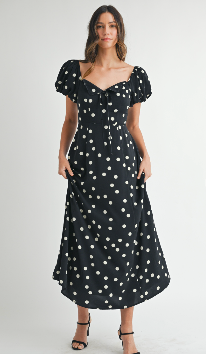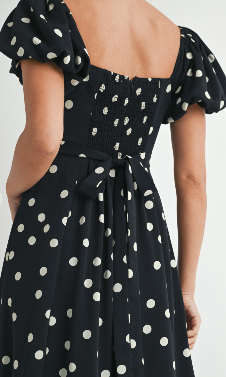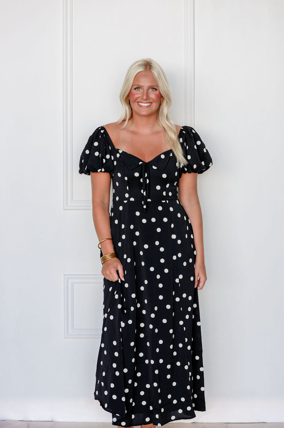 The Black Polka Dot Midi Dress is effortlessly chic with a timeless twist. Featuring a classic black base with crisp white dots, a flattering midi length, and a breezy silhouette.