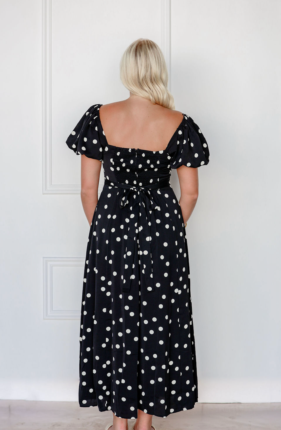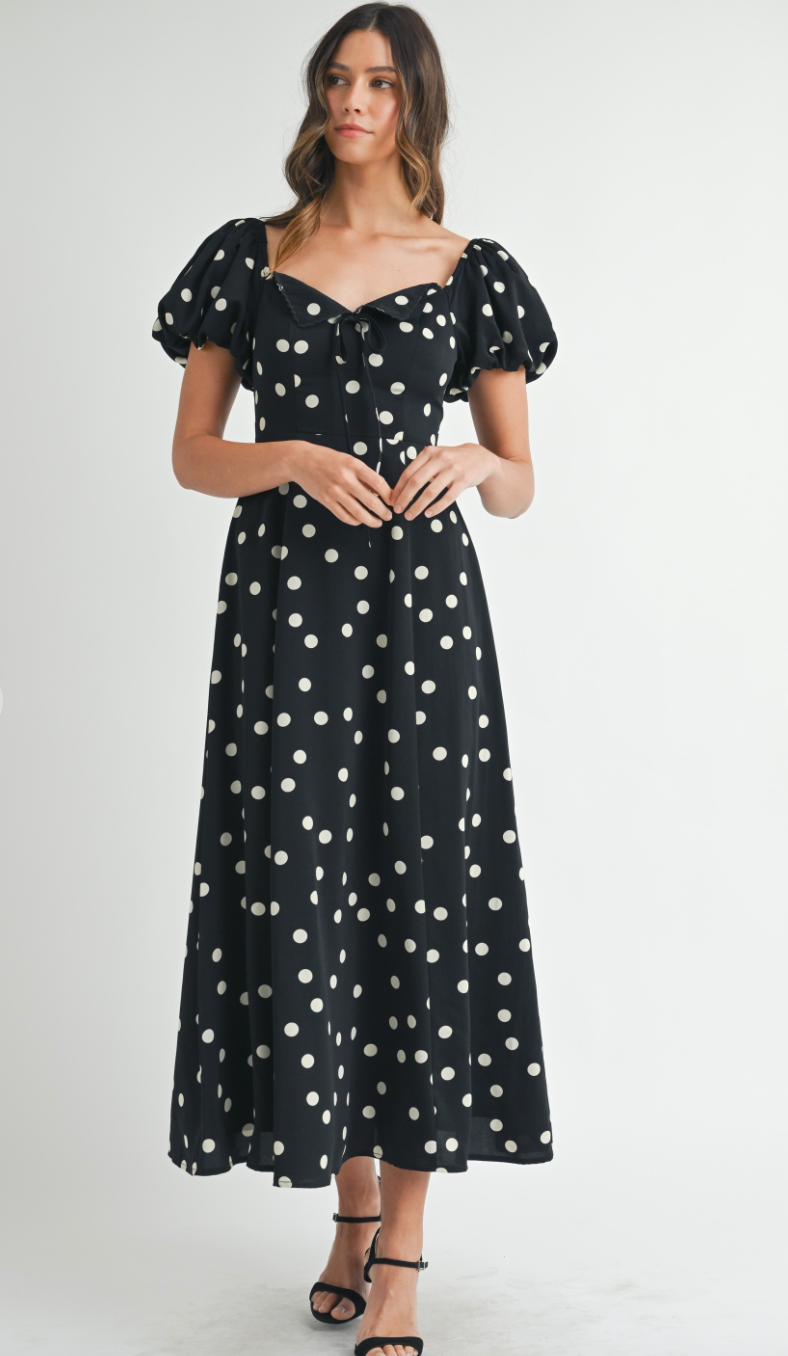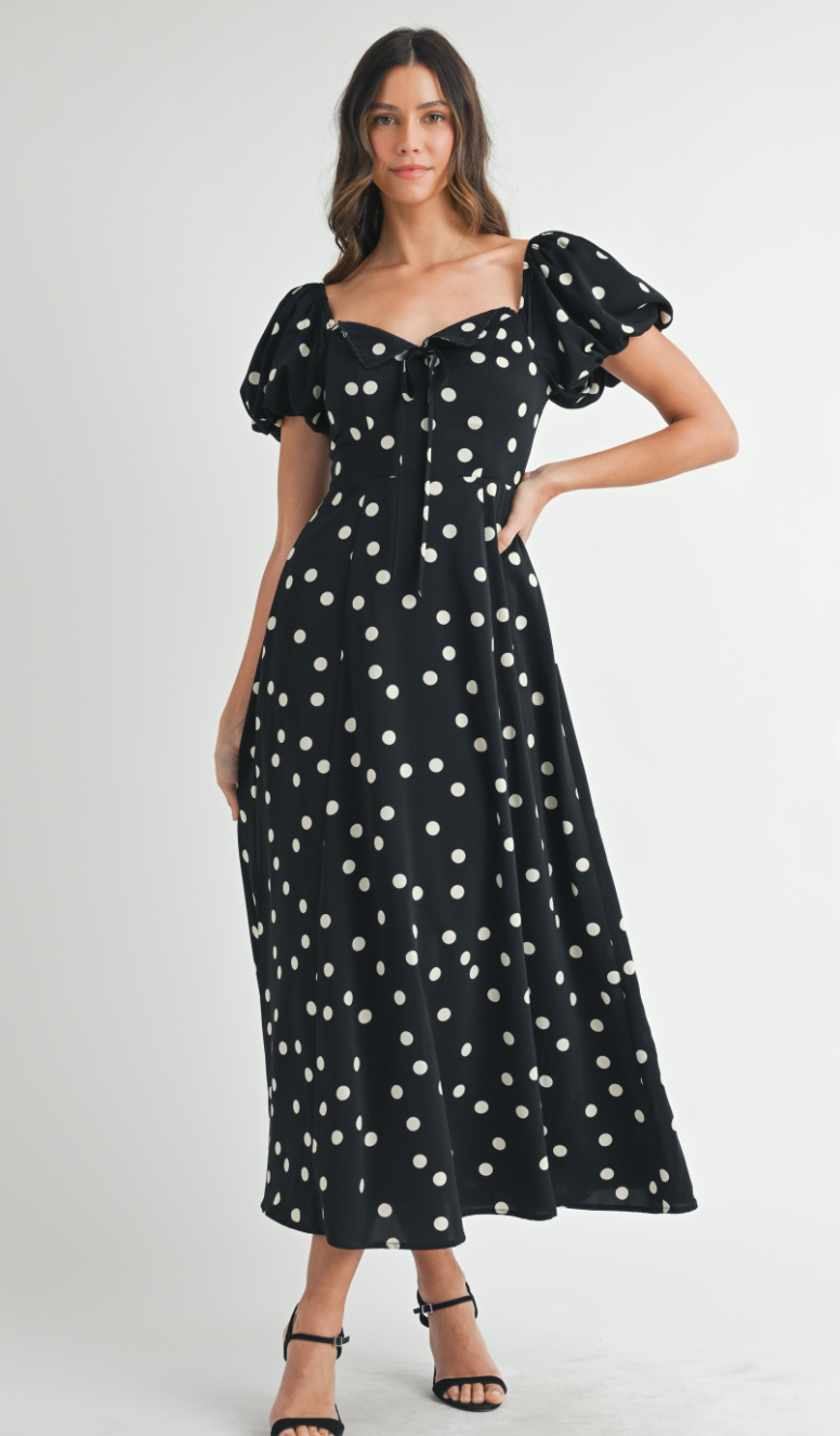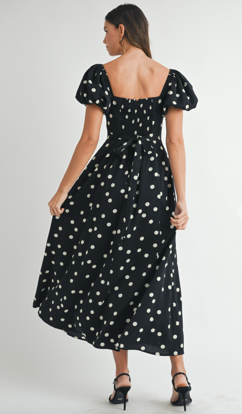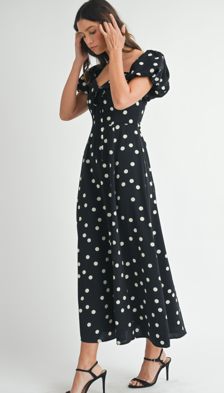 The Black Polka Dot Midi Dress is effortlessly chic with a timeless twist. Featuring a classic black base with crisp white dots, a flattering midi length, and a breezy silhouette.