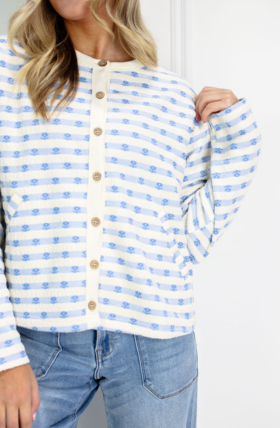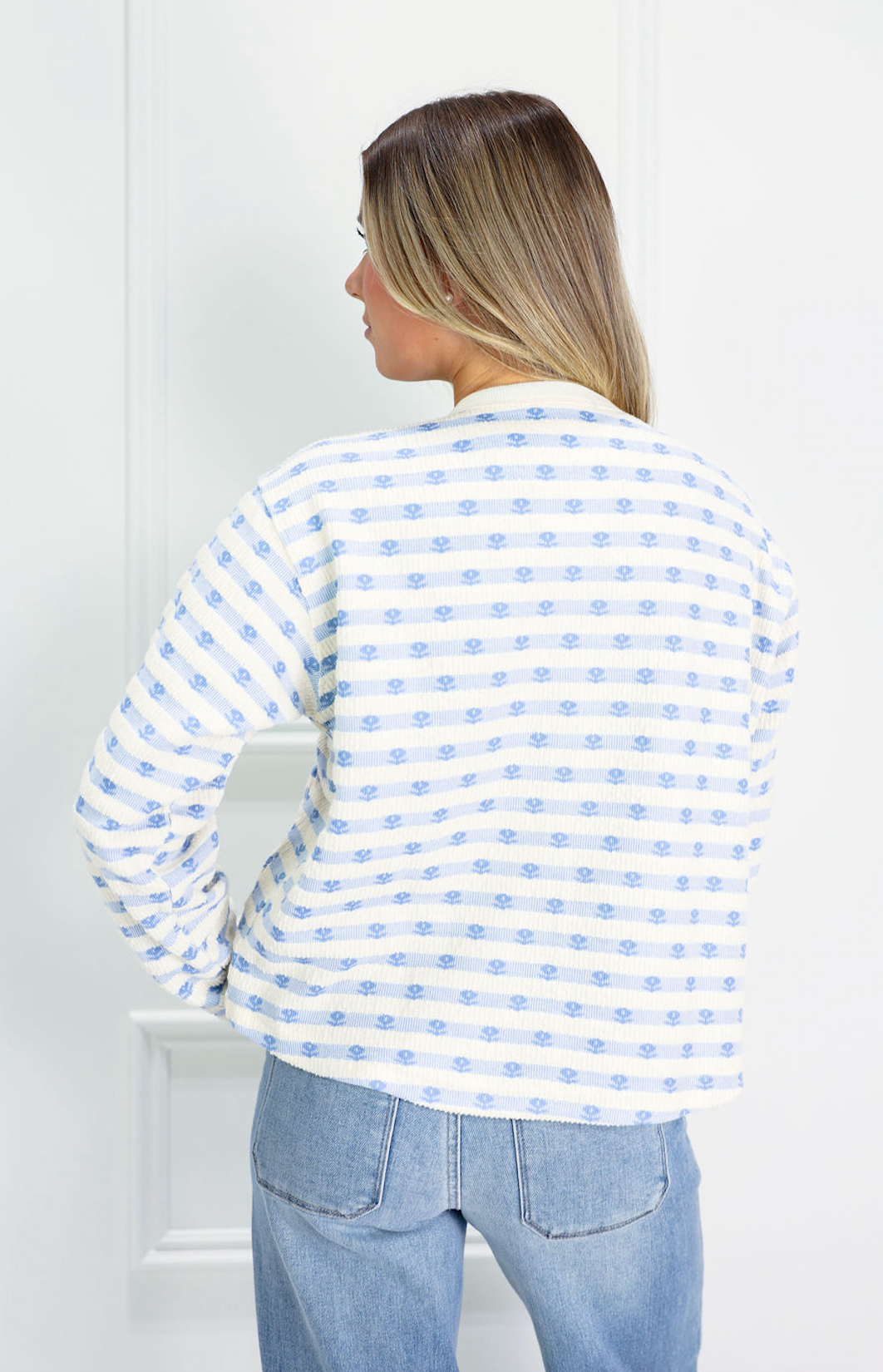 The Blue Floral Stripe Cardigan adds a sweet touch to any look with its soft knit, contrast stripes, and delicate floral embroidery. Lightweight and charming—perfect for layering year-round.