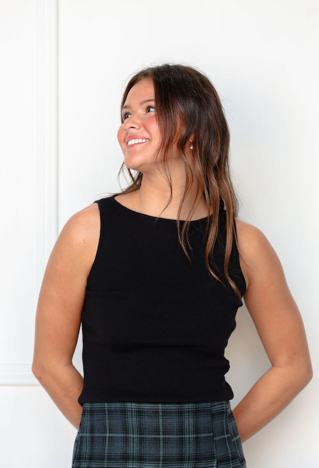 This black boat neck knit top offers a sleek and timeless silhouette, with a wide neckline that highlights the collarbones and a soft, comfortable knit fabric.