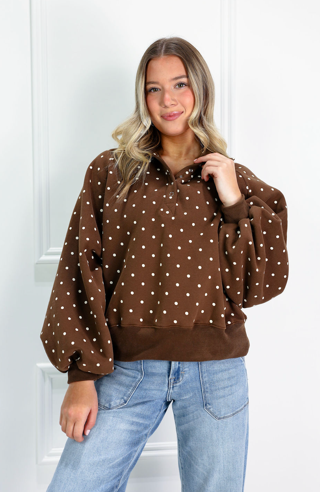 Effortless style meets playful charm in this brown pullover featuring crisp white polka dots. The convenient snap button front makes layering a breeze, while the classic pattern works with virtually any outfit. Perfect for casual days when you want comfort without compromising on looks.