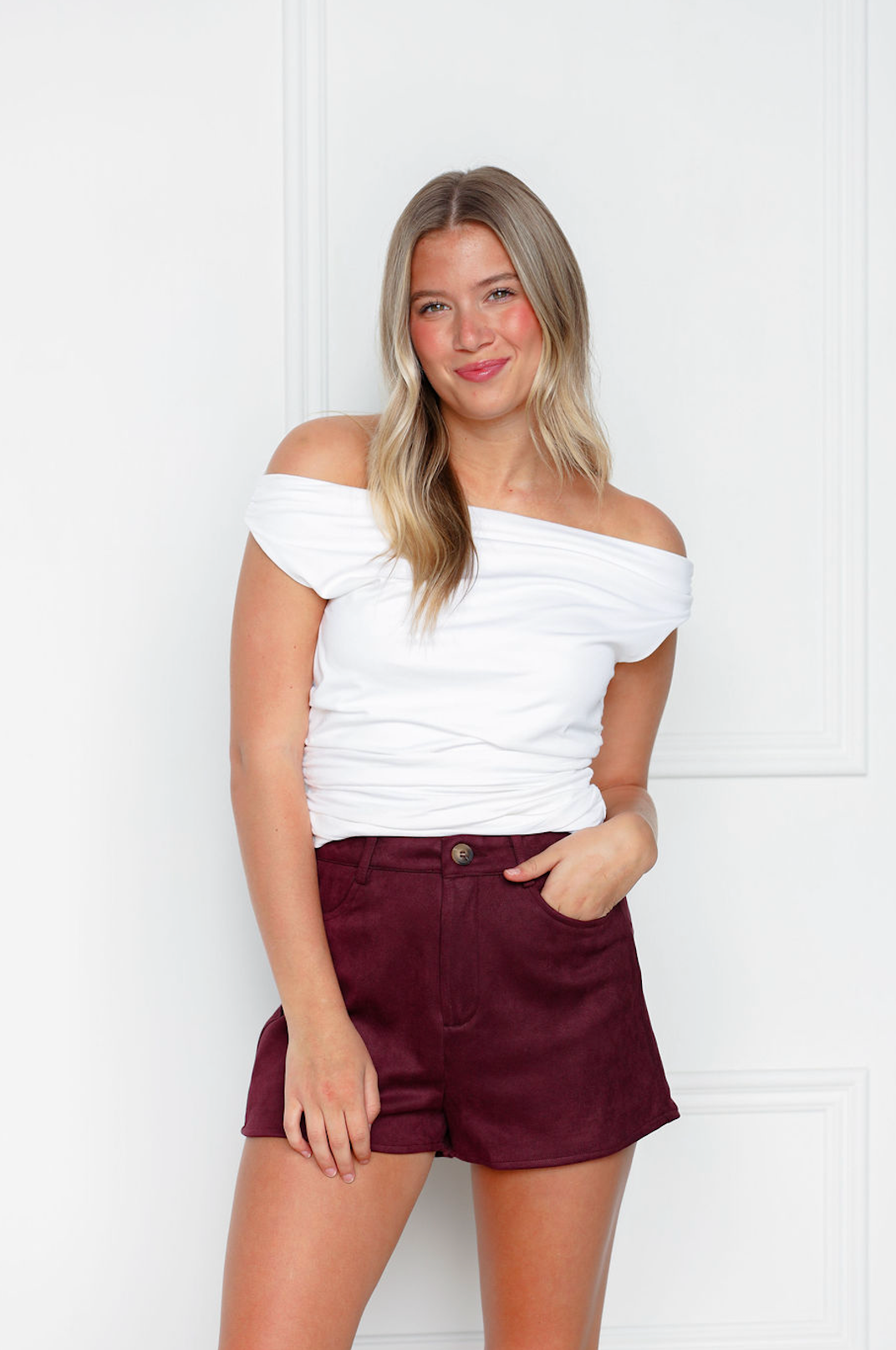 Rich in color and luxe in texture, these burgundy suede shorts bring elevated edge to any outfit. Featuring a high-rise fit, tailored silhouette, and soft faux suede finish, they’re perfect for dressing up with boots or down with sneakers for effortless fall styling.