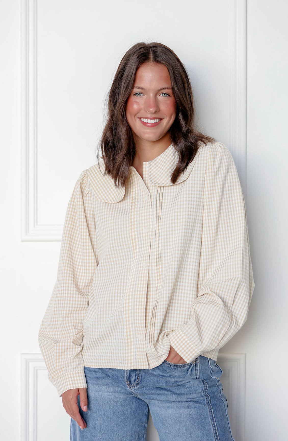Sweet and easy—this butter yellow gingham blouse features button-front detailing and a relaxed, everyday fit.