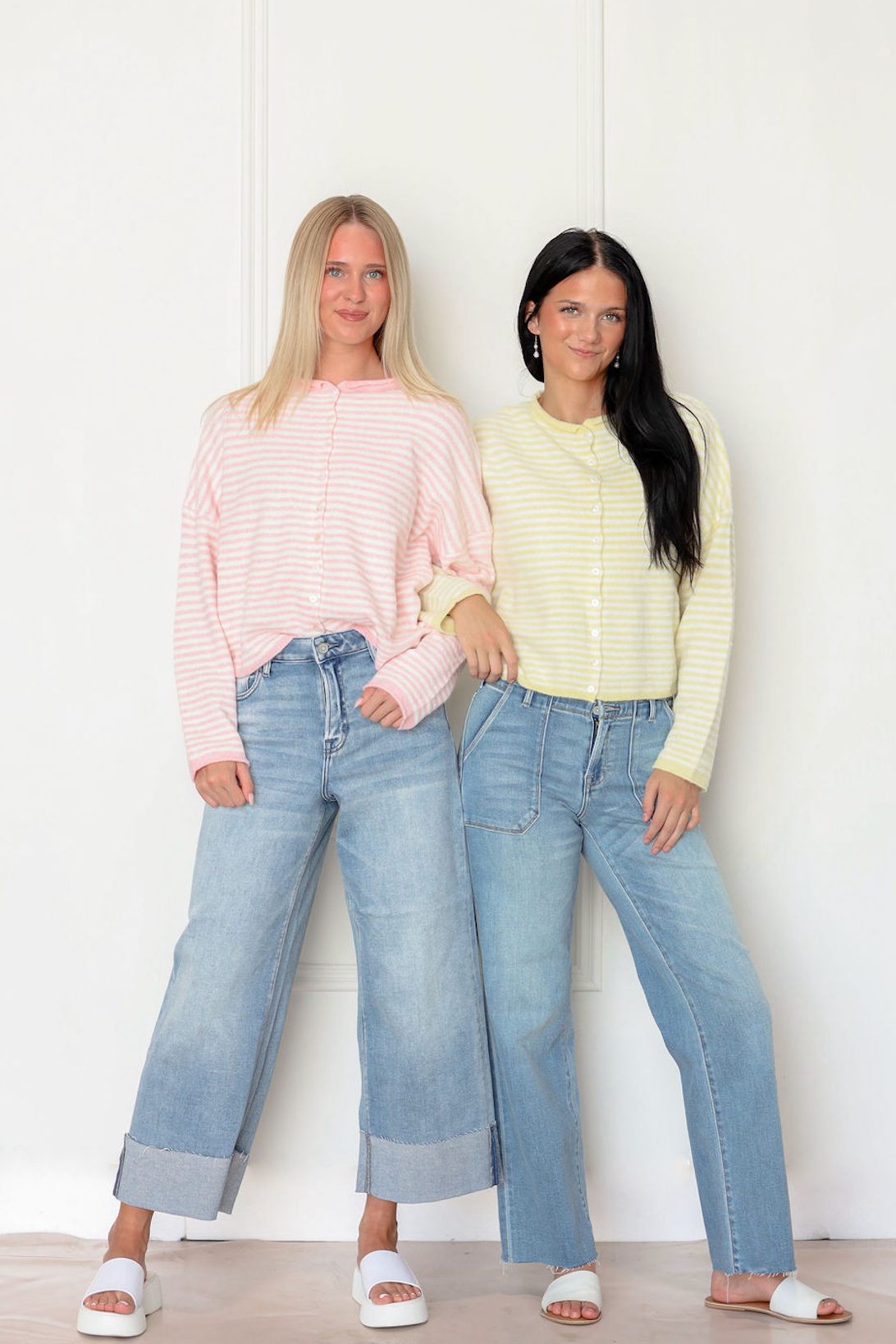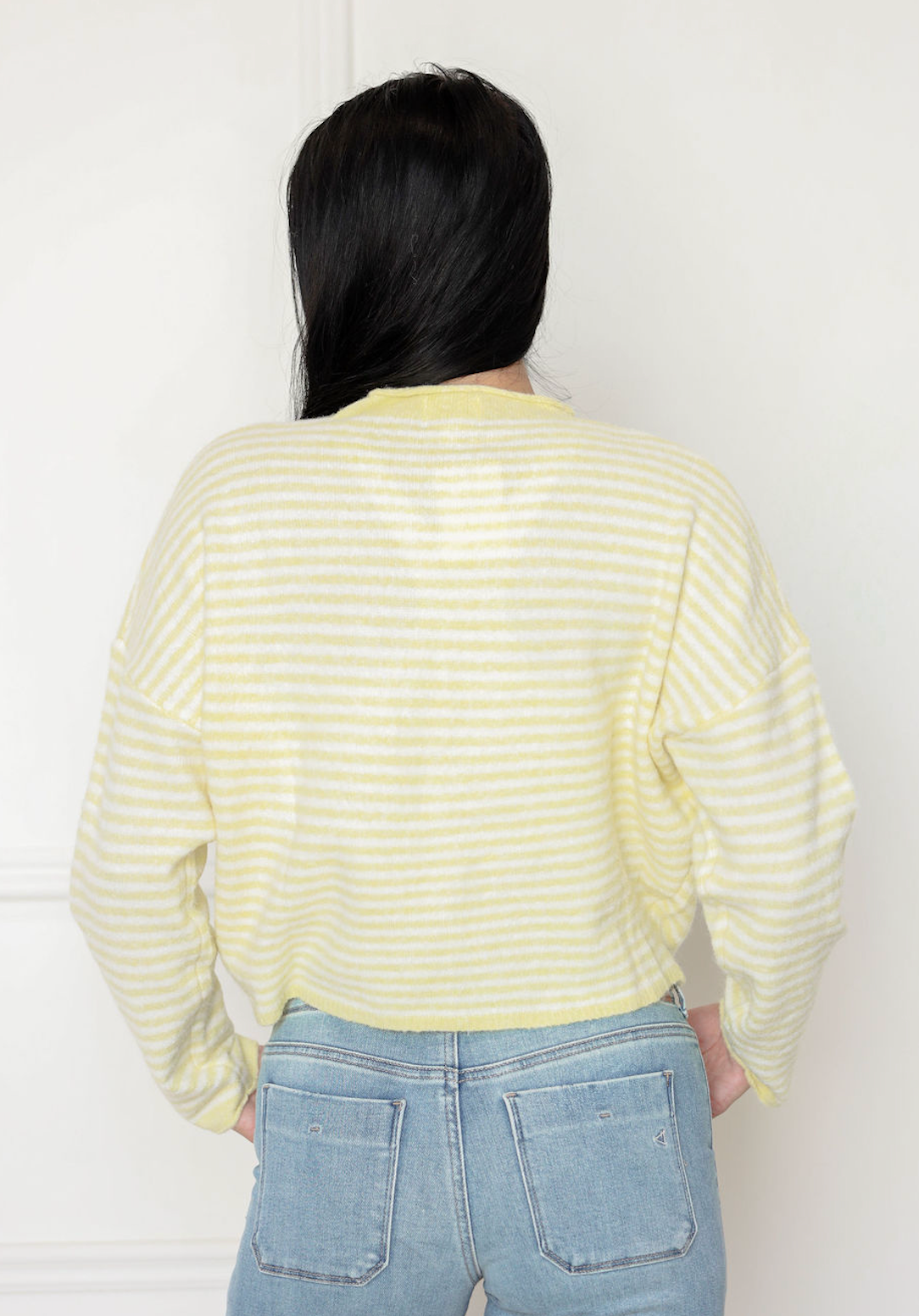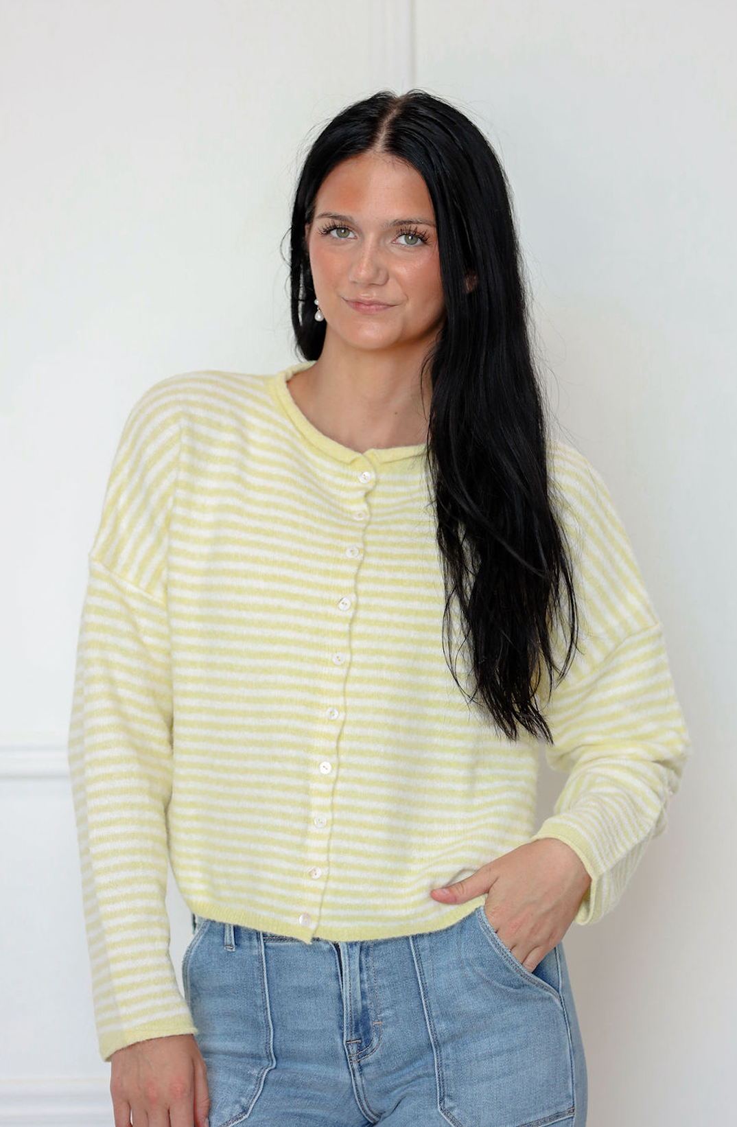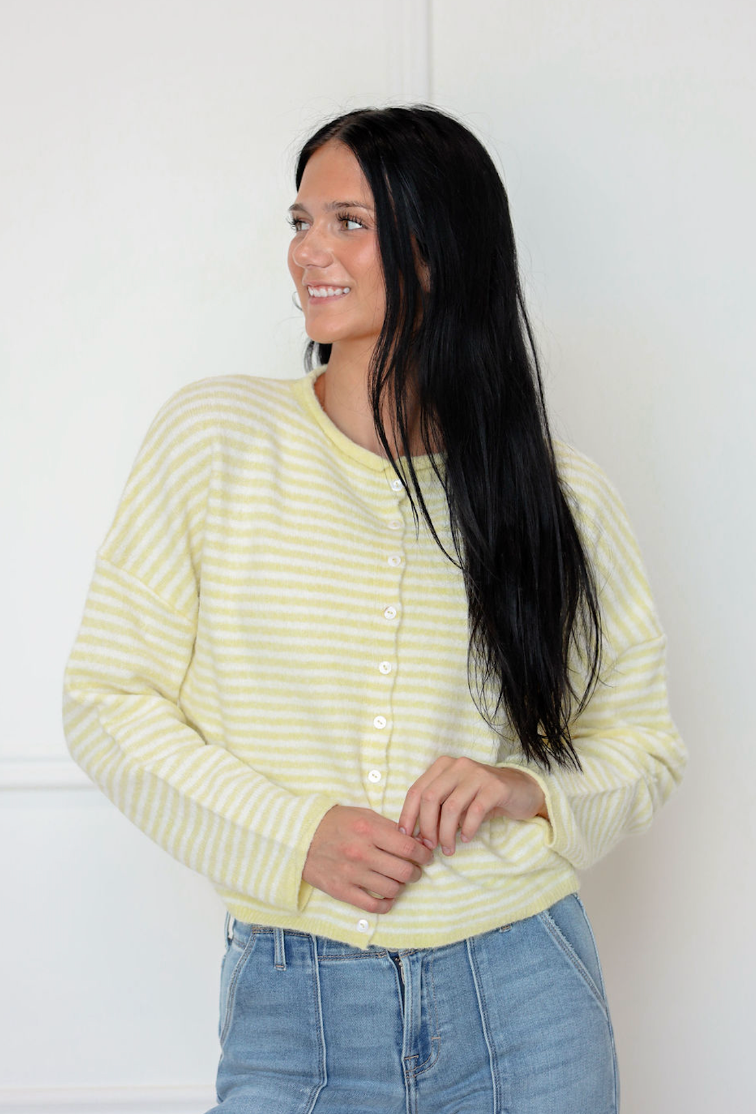 Yellow and white stripe cardigan with a button-down front and soft knit texture for a cheerful, everyday layer.