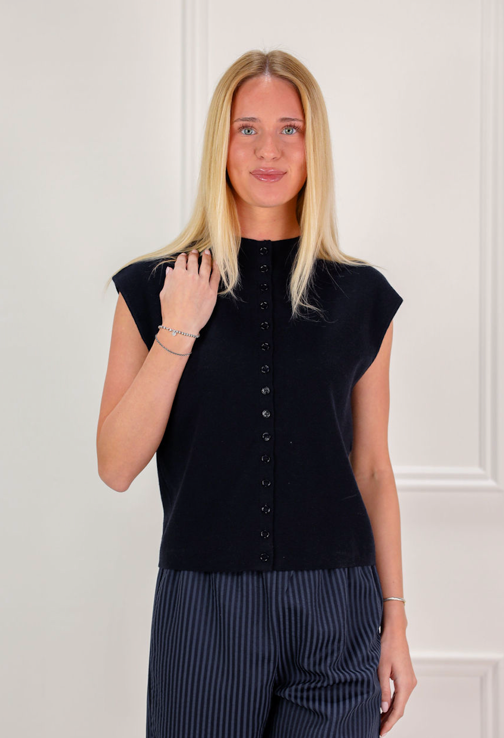 Stay warm and stylish in this navy knit sweater with charming cap sleeves. The soft knit fabric provides cozy comfort while the structured cap sleeves add a feminine touch. Layer it over a collared shirt for dimension or wear solo for understated elegance. A timeless piece that works year-round and pairs effortlessly with your favorite bottoms.
