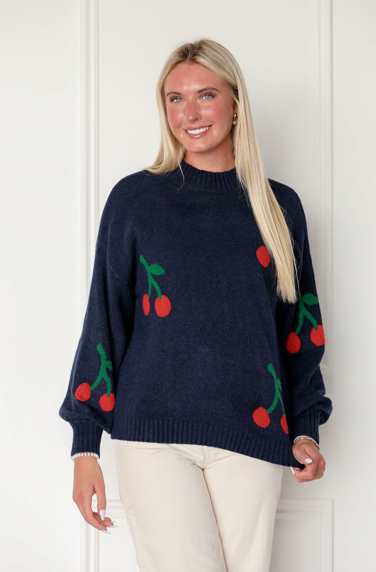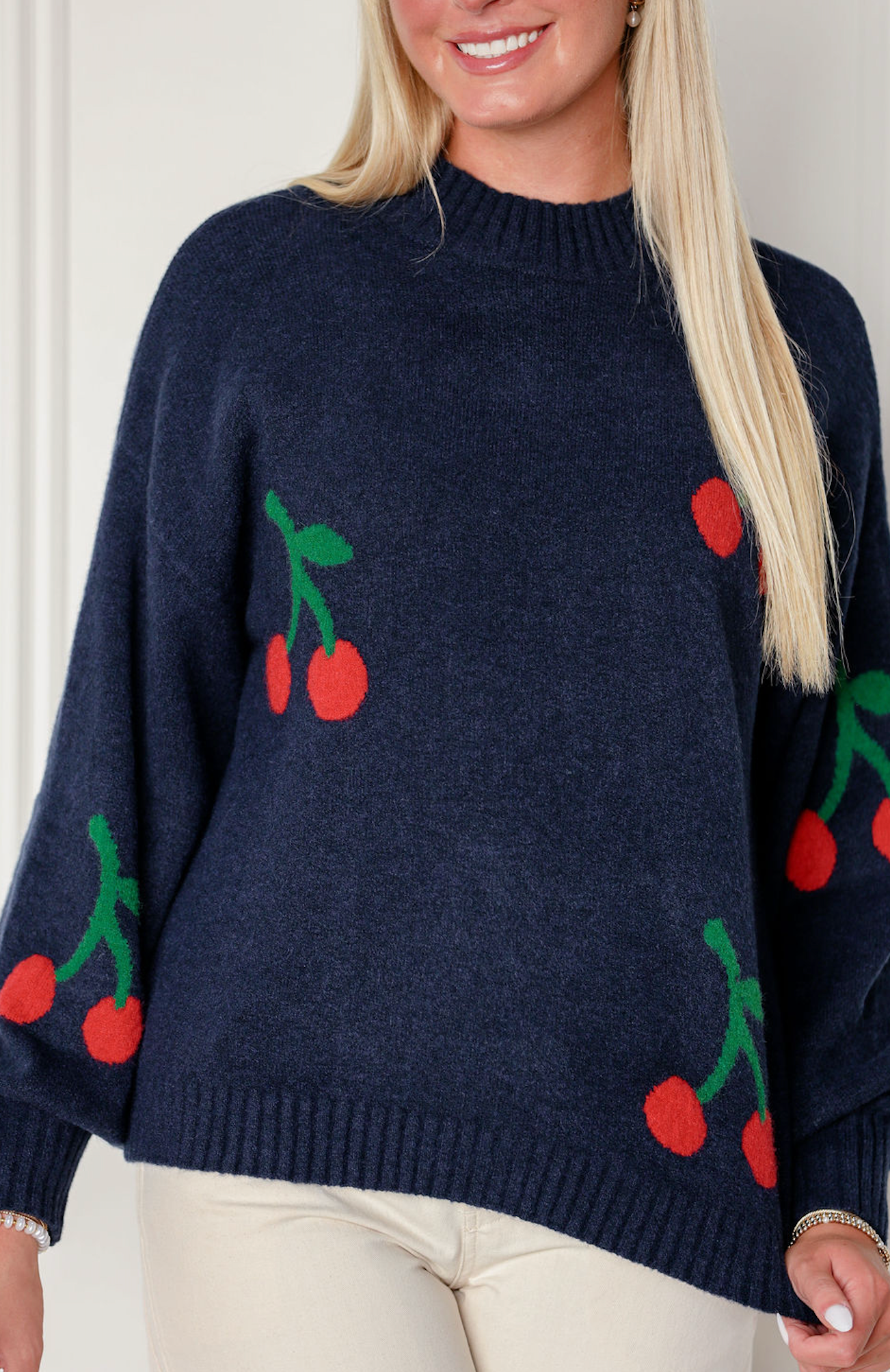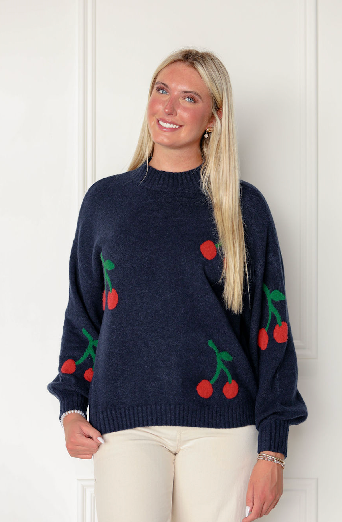 Sweet meets cozy in this navy knit top featuring embroidered cherry details, a classic crew neckline, and a slightly cropped fit.