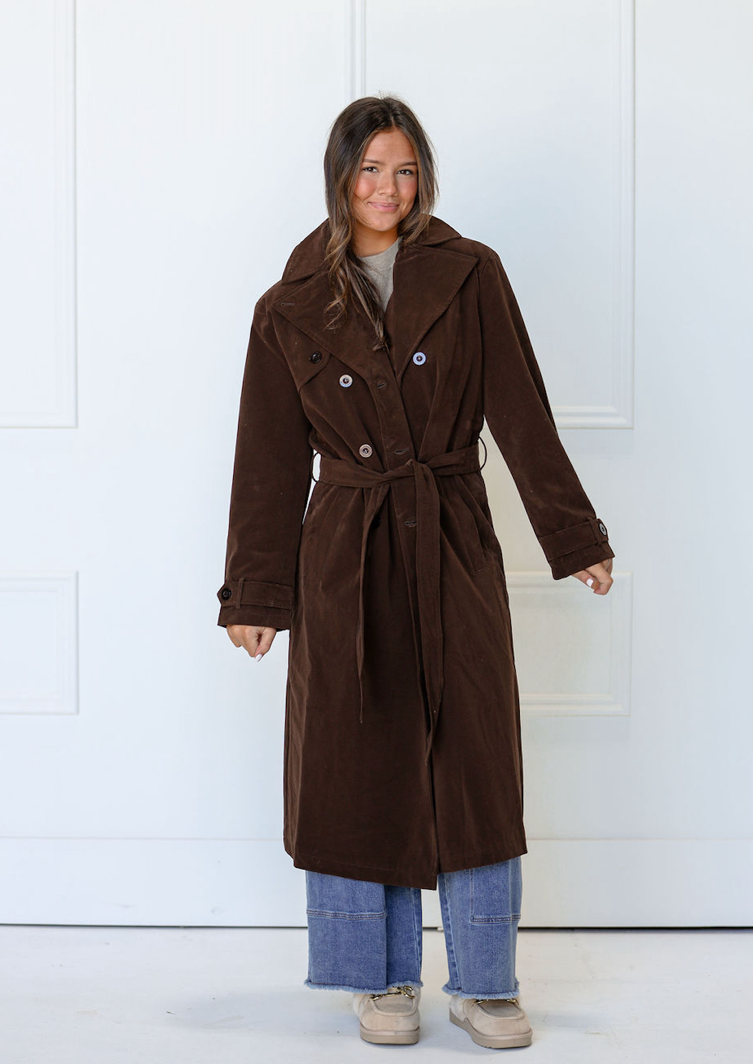 The Chocolate Trench Coat is your go-to layer for effortless sophistication. This rich, warm brown shade works with virtually any outfit, while the classic trench silhouette adds instant polish to casual looks. Featuring a structured fit and timeless design, it's perfect for layering through seasons.