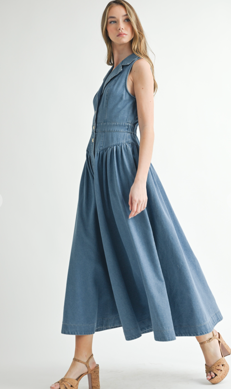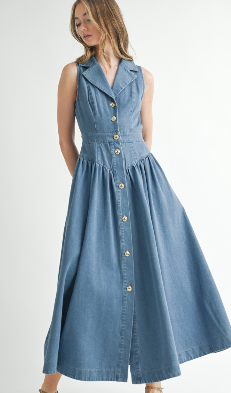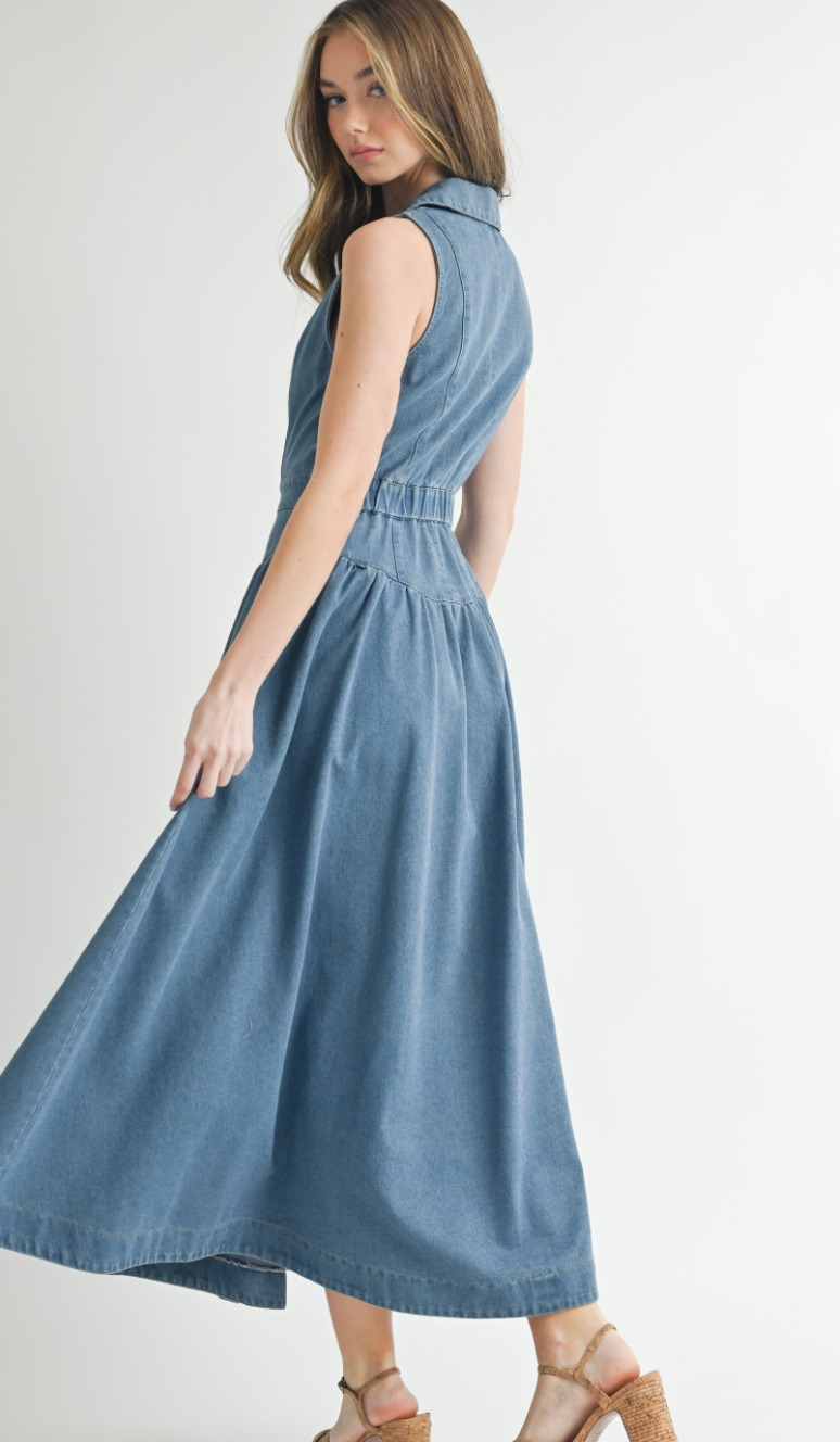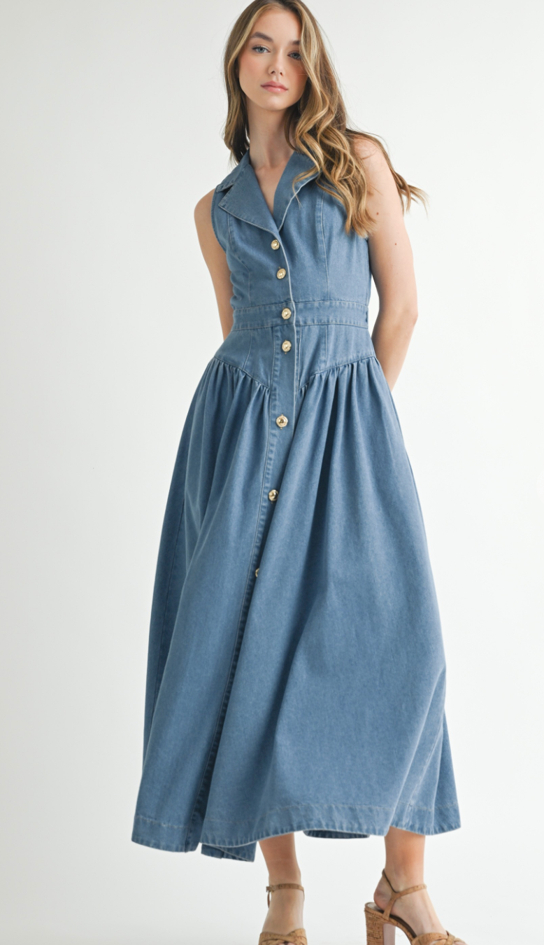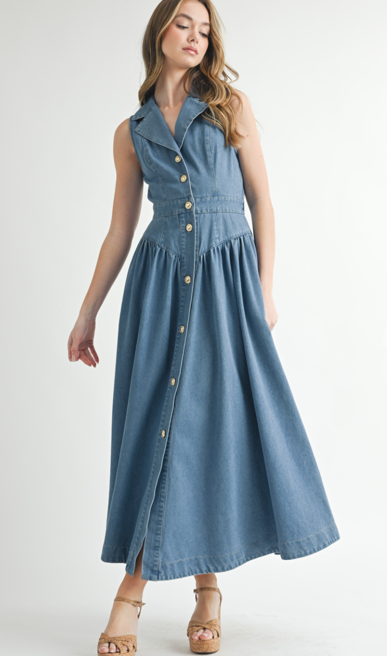 The Collared Denim Midi Dress blends vintage charm with modern ease—featuring a sleeveless cut, button-down front, and defined waist for a flattering silhouette rooted in western nostalgia.