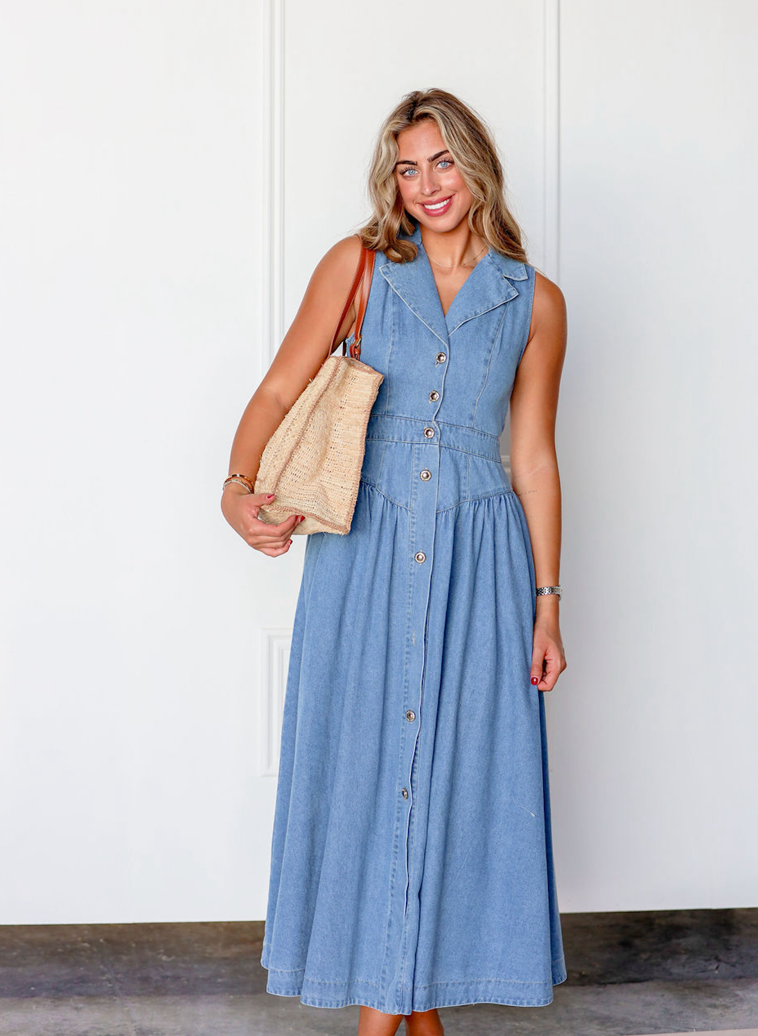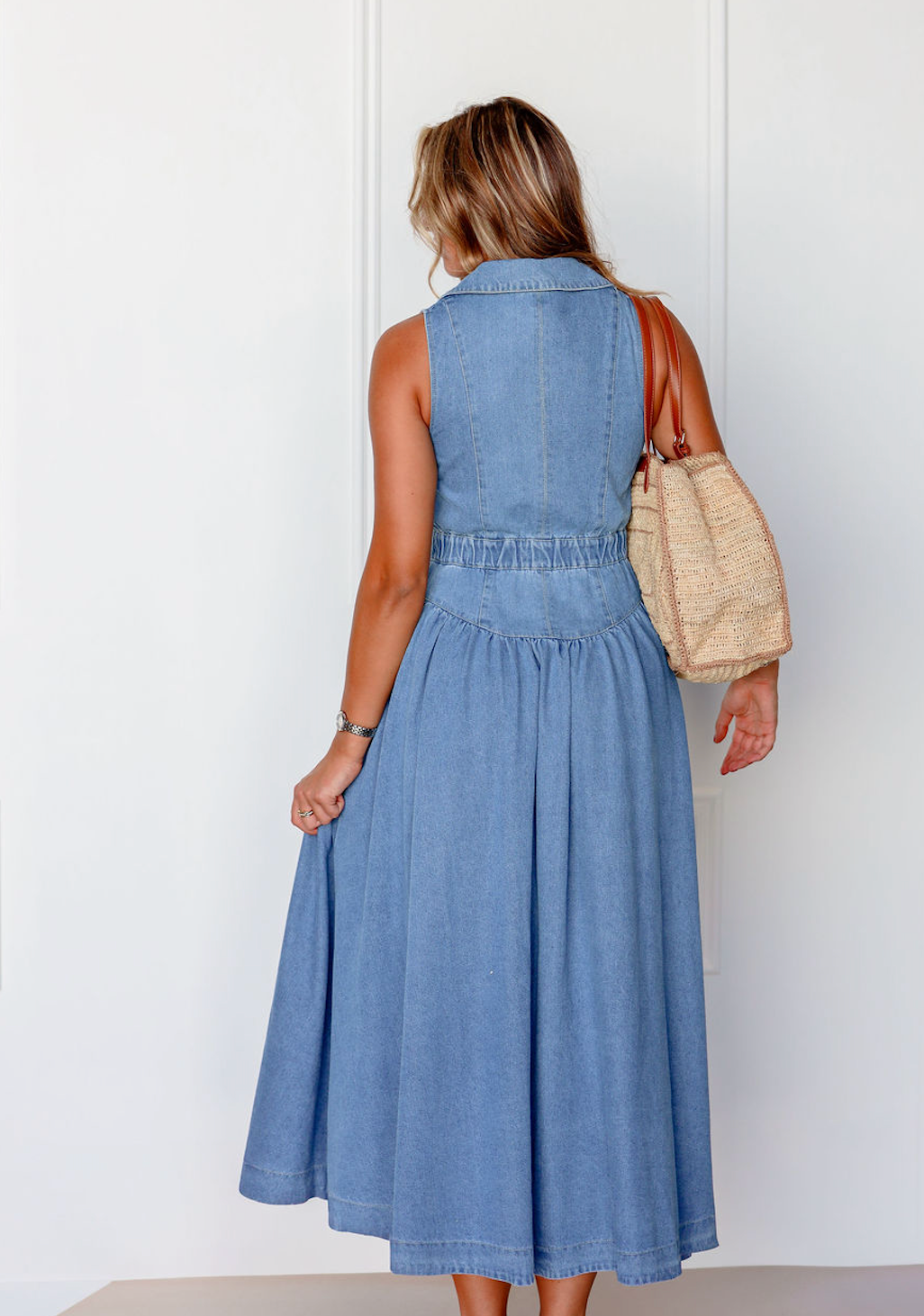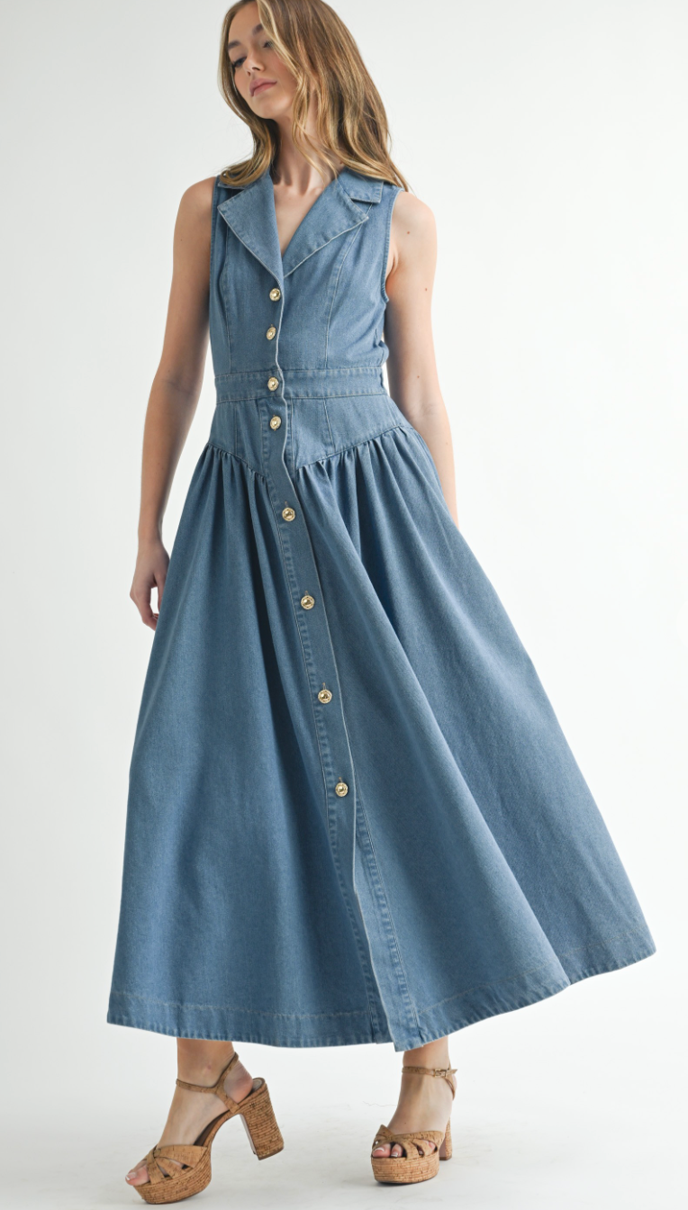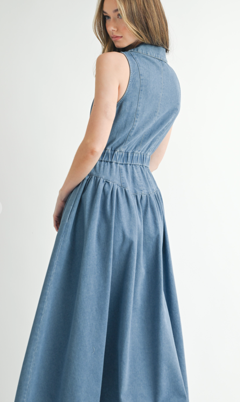The Collared Denim Midi Dress blends vintage charm with modern ease—featuring a sleeveless cut, button-down front, and defined waist for a flattering silhouette rooted in western nostalgia.