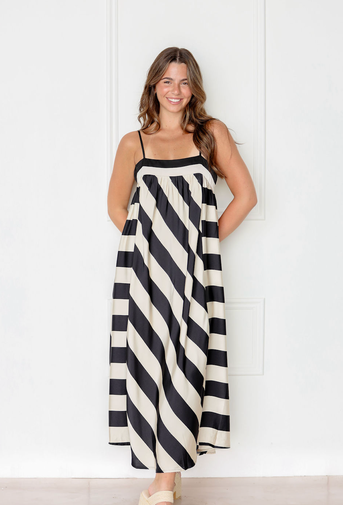 The Cream/Black Stripes Maxi Dress is a playful twist on a classic! With bold diagonal stripes, a breezy maxi silhouette, and delicate spaghetti straps, it’s chic, comfy, and easy to dress up or down all season long.