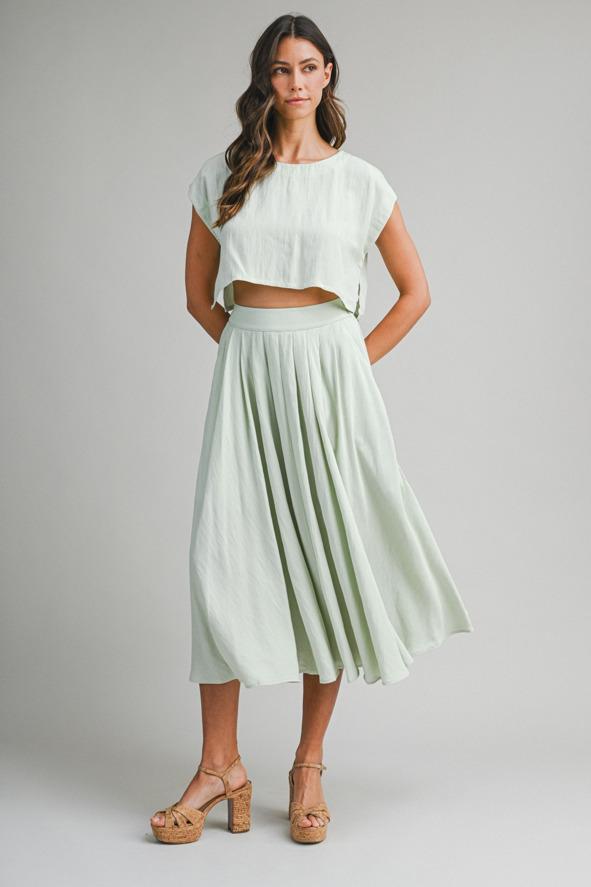 Elevate your wardrobe with this versatile two-piece set featuring a fitted cropped top paired with a flowing midi skirt in soft sage. The coordinated ensemble offers effortless styling for casual outings, brunch dates, or layered looks. The cropped silhouette balances the midi length for a flattering, modern aesthetic. Perfect for mixing and matching with your existing pieces or wearing together for a polished, put-together appearance.