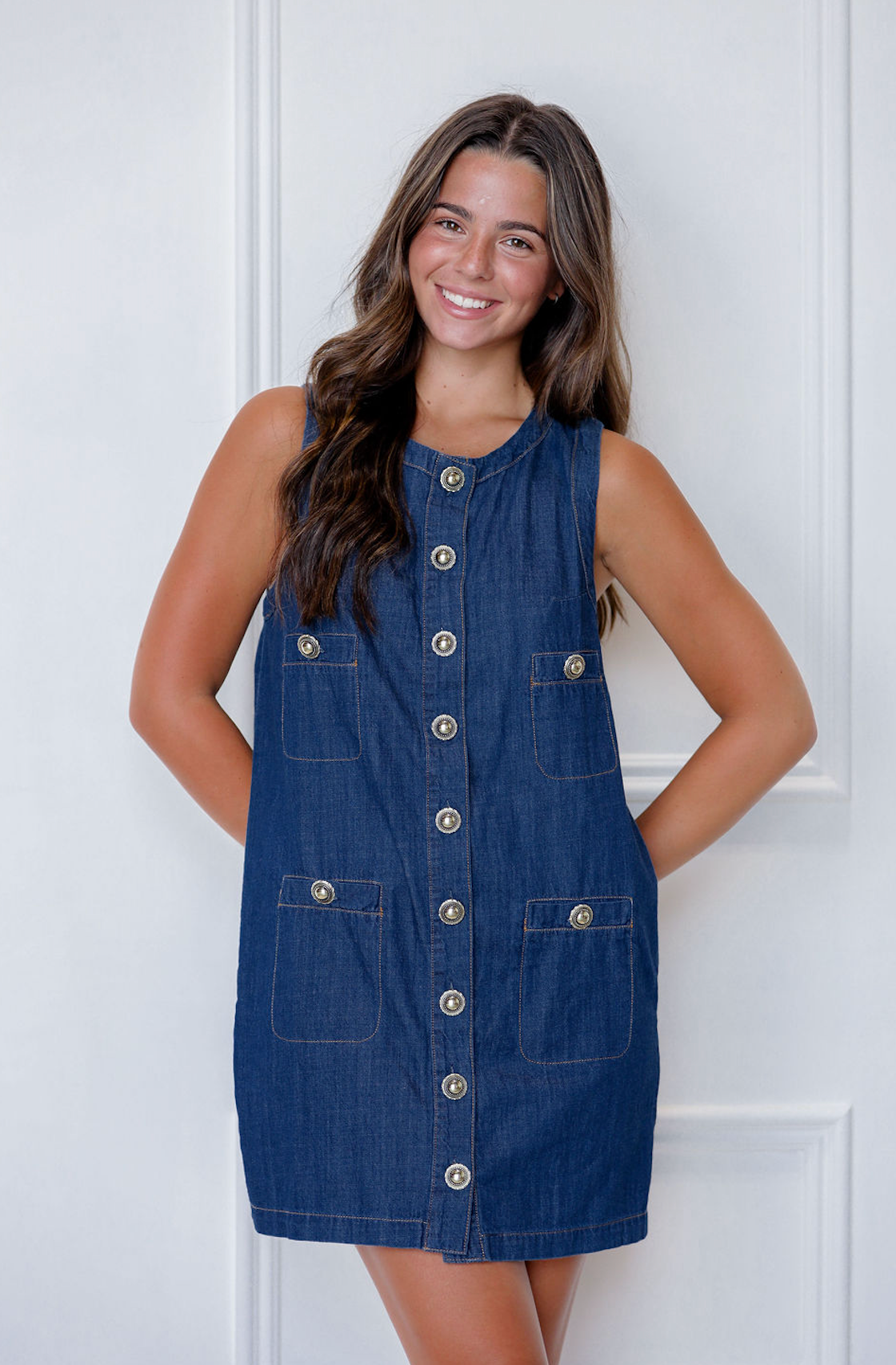 The Darla Denim Dress features a sleeveless cut with a structured fit, gold button front, and four patch pockets for a touch of utility style. A bold, retro-inspired staple with a modern edge.