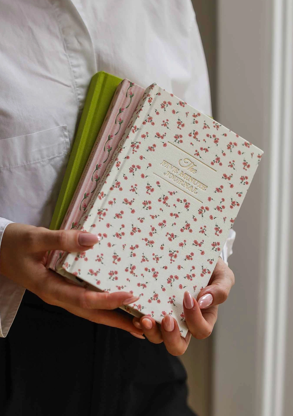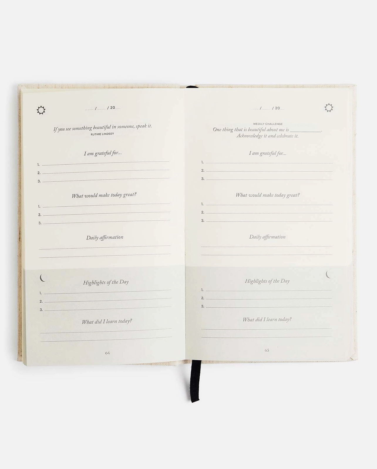 The Five Minute Journal is the original guided gratitude journal that's sold over 2 million copies. In just five minutes a day, it helps clear the mental clutter and shift focus to the good stuff. It’s straightforward, no fuss, and like a toothbrush for your mind. Whether your schedule’s packed, you’re new to journaling, or you just never know what to say, this journal is here to help. Its prompts guide you through reflecting on the positive aspects of your day, making it a simple routine to boost your mood and overall happiness. Plus, it’s designed to be as easy as possible, with a guided introduction that eases you into the habit and a clean, minimalist design that makes every page a pleasure to fill out. Undated, lasts 6 months 264 pages 100% recycled FSC paper 100% linen and cotton fabric One 100% cotton ribbon Exclusive Ditsy Rose