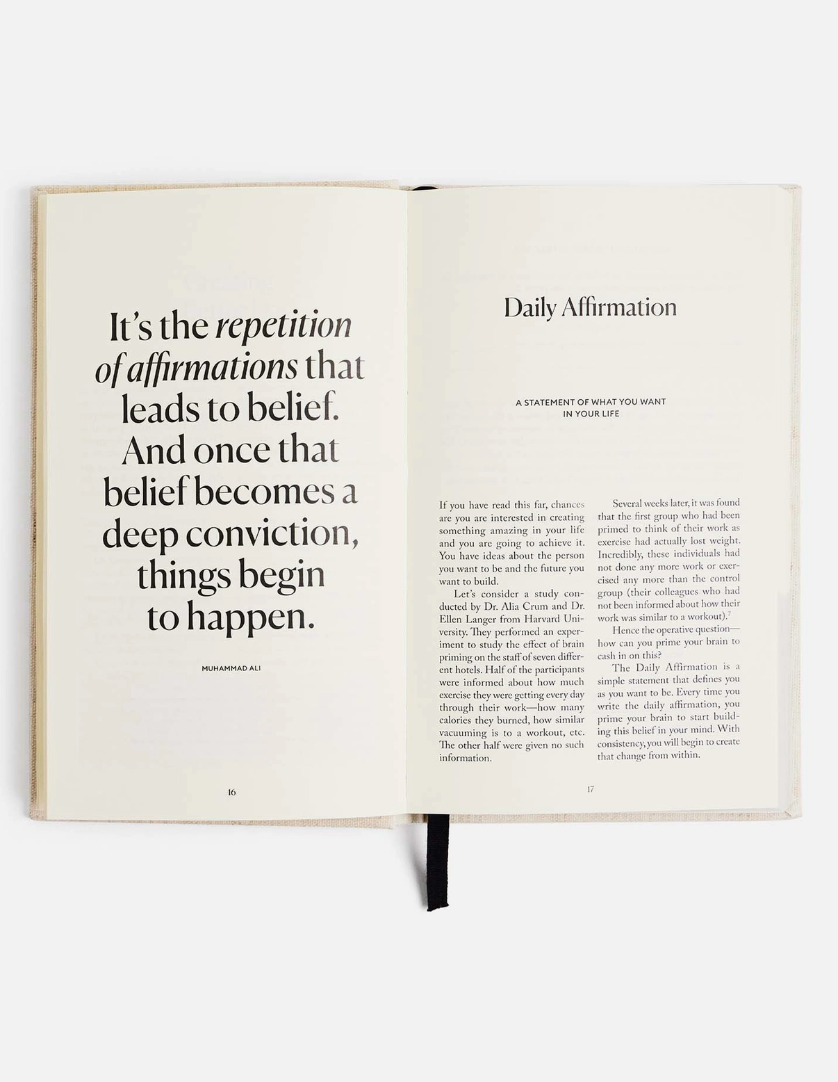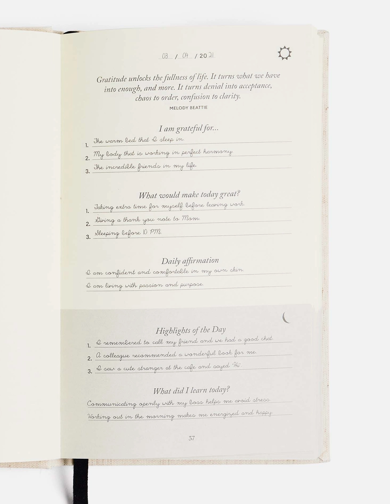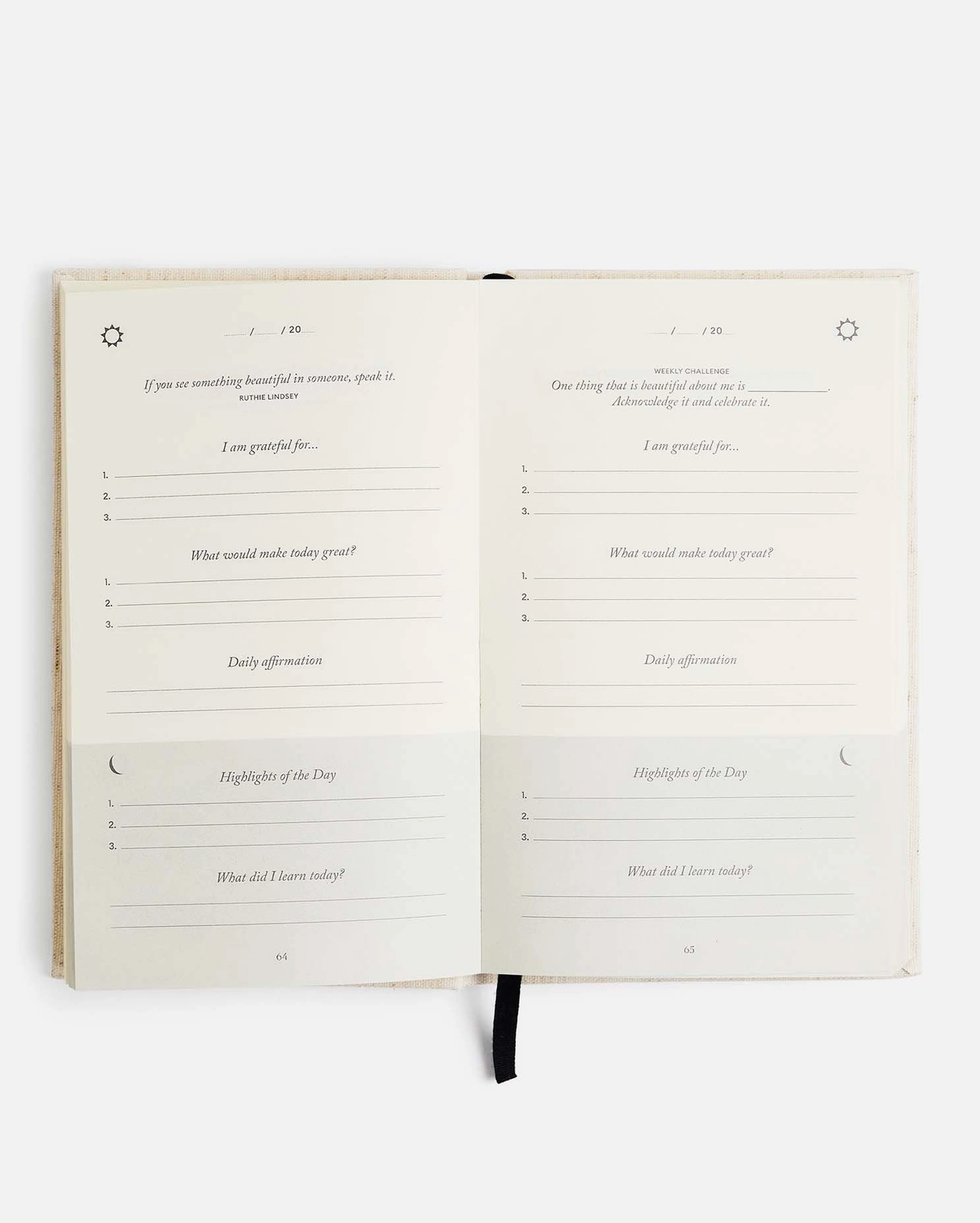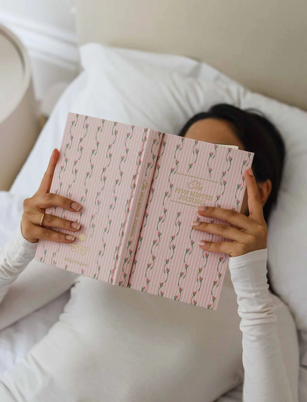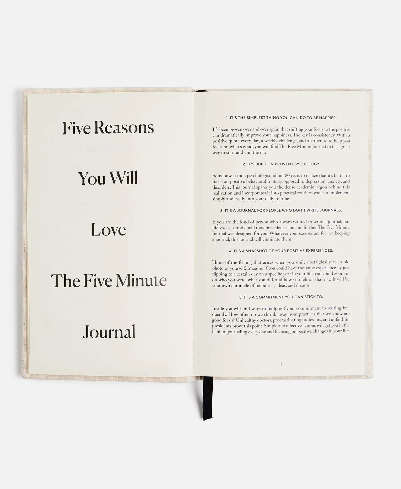 The Five Minute Journal is the original guided gratitude journal that's sold over 2 million copies. In just five minutes a day, it helps clear the mental clutter and shift focus to the good stuff. It’s straightforward, no fuss, and like a toothbrush for your mind. Whether your schedule’s packed, you’re new to journaling, or you just never know what to say, this journal is here to help. Its prompts guide you through reflecting on the positive aspects of your day, making it a simple routine to boost your mood and overall happiness. Plus, it’s designed to be as easy as possible, with a guided introduction that eases you into the habit and a clean, minimalist design that makes every page a pleasure to fill out. Undated, lasts 6 months 264 pages 100% recycled FSC paper 100% linen and cotton fabric One 100% cotton ribbon Exclusive Ditsy Rose