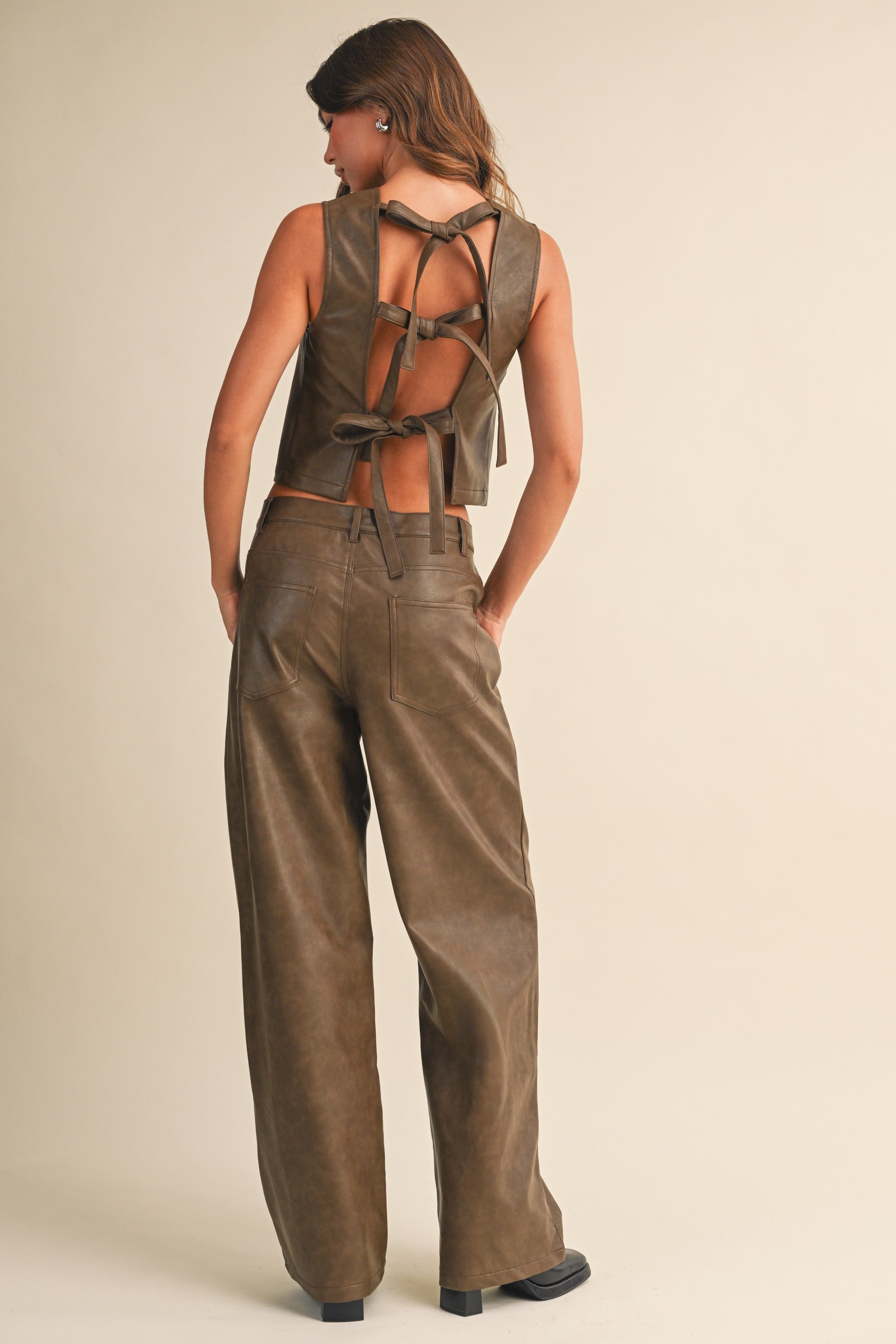 This two-piece set combines edgy style with everyday comfort. The sleeveless faux leather top features an open tie-back design that adds a modern twist, while the matching pants complete the look with versatility. The rich brown tone works with nearly everything in your wardrobe, making this set a go-to choice for effortless, put-together looks!