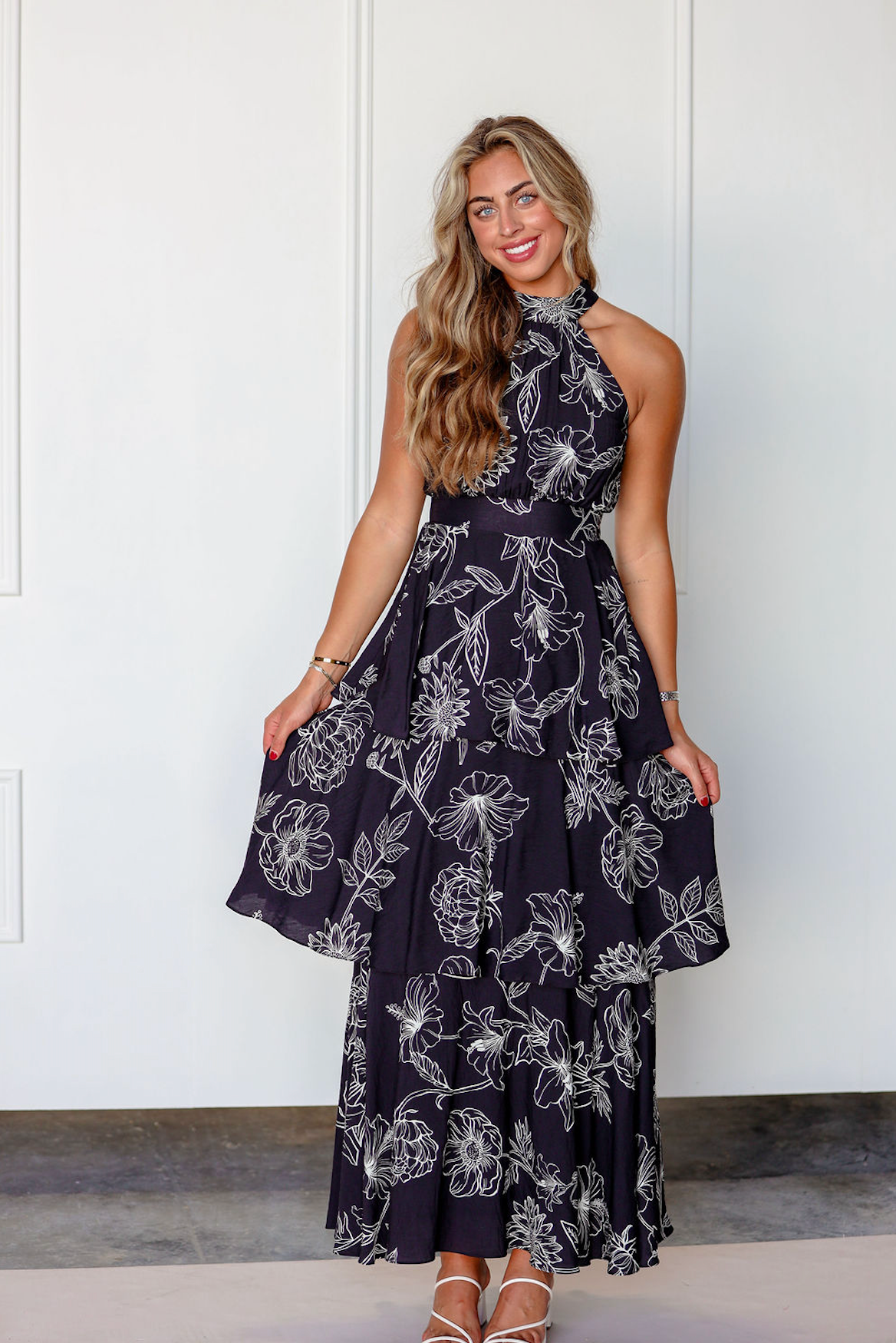 The Floral Halter Neck Maxi Dress features a fitted high neckline, flowy tiered skirt, and bold floral print in contrasting ivory. A standout piece for weddings, garden parties, or dressy summer nights.