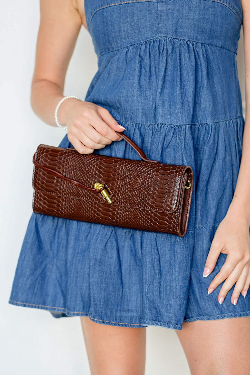 Structured and sleek in rich brown croc-embossed faux leather with gold-tone hardware. A classic grab-and-go piece for polished style.