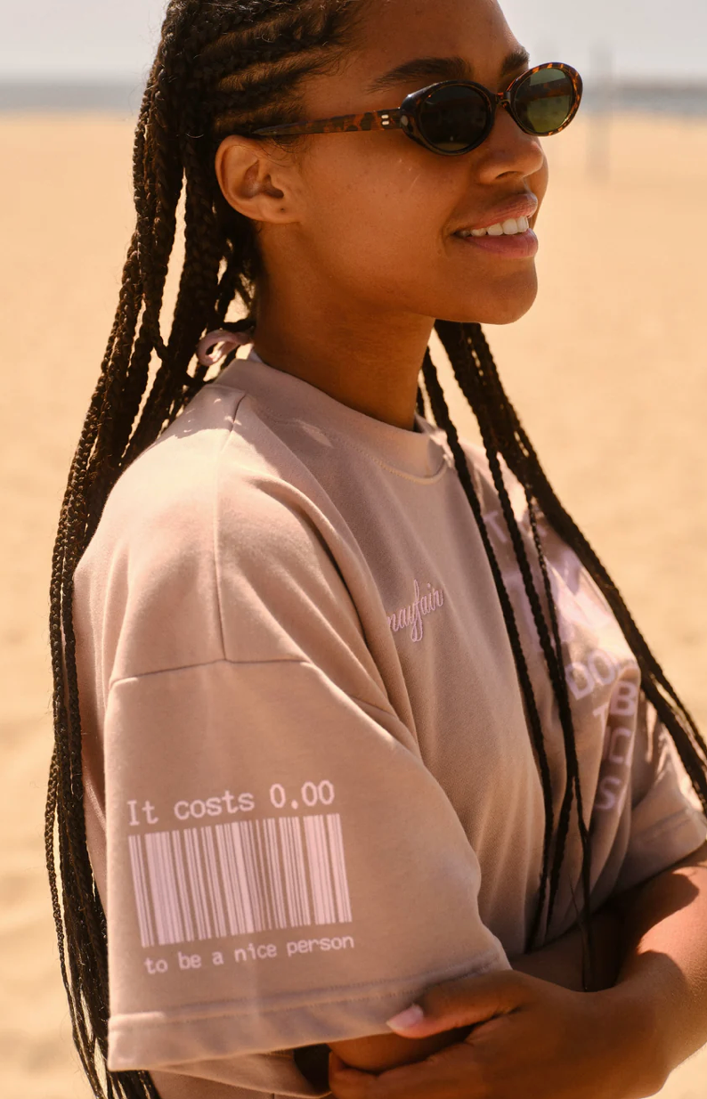 - 'it costs 0.00 to be a nice person' screen printed in pink on right arm with barcode graphic