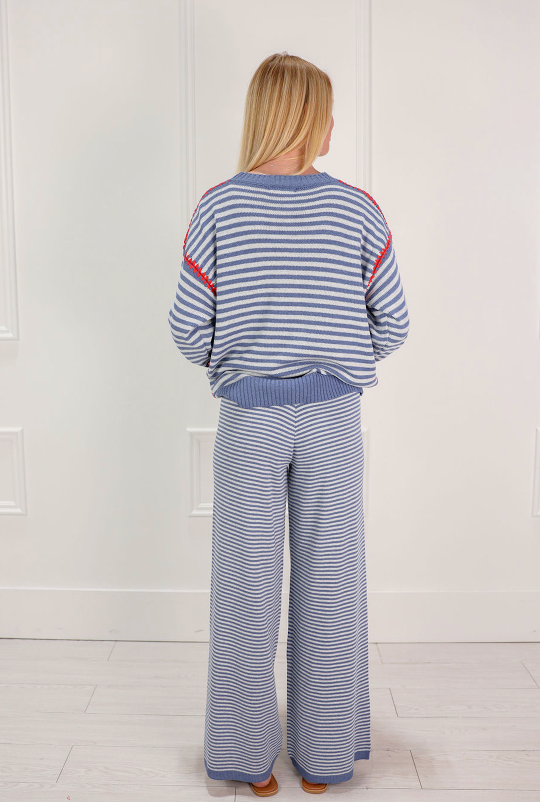 Elevate your wardrobe with this coordinated Marine Stripe Sweater & Pants Set. The classic striped sweater pairs perfectly with matching pants for a polished, put-together look. Crafted for comfort and style, this two-piece set offers versatility for casual outings or relaxed weekends. The nautical-inspired stripes add visual interest while remaining timeless and easy to mix with other pieces. Ideal for those seeking effortless coordination without compromising on quality or design.