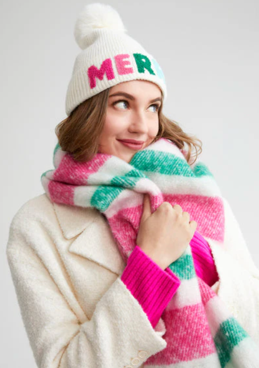 The Merry Beanie in ivory is a festive and cozy winter essential. Crafted from soft knit fabric and featuring elegant embroidered lettering, it adds a touch of holiday cheer and warmth to any cold-weather look.