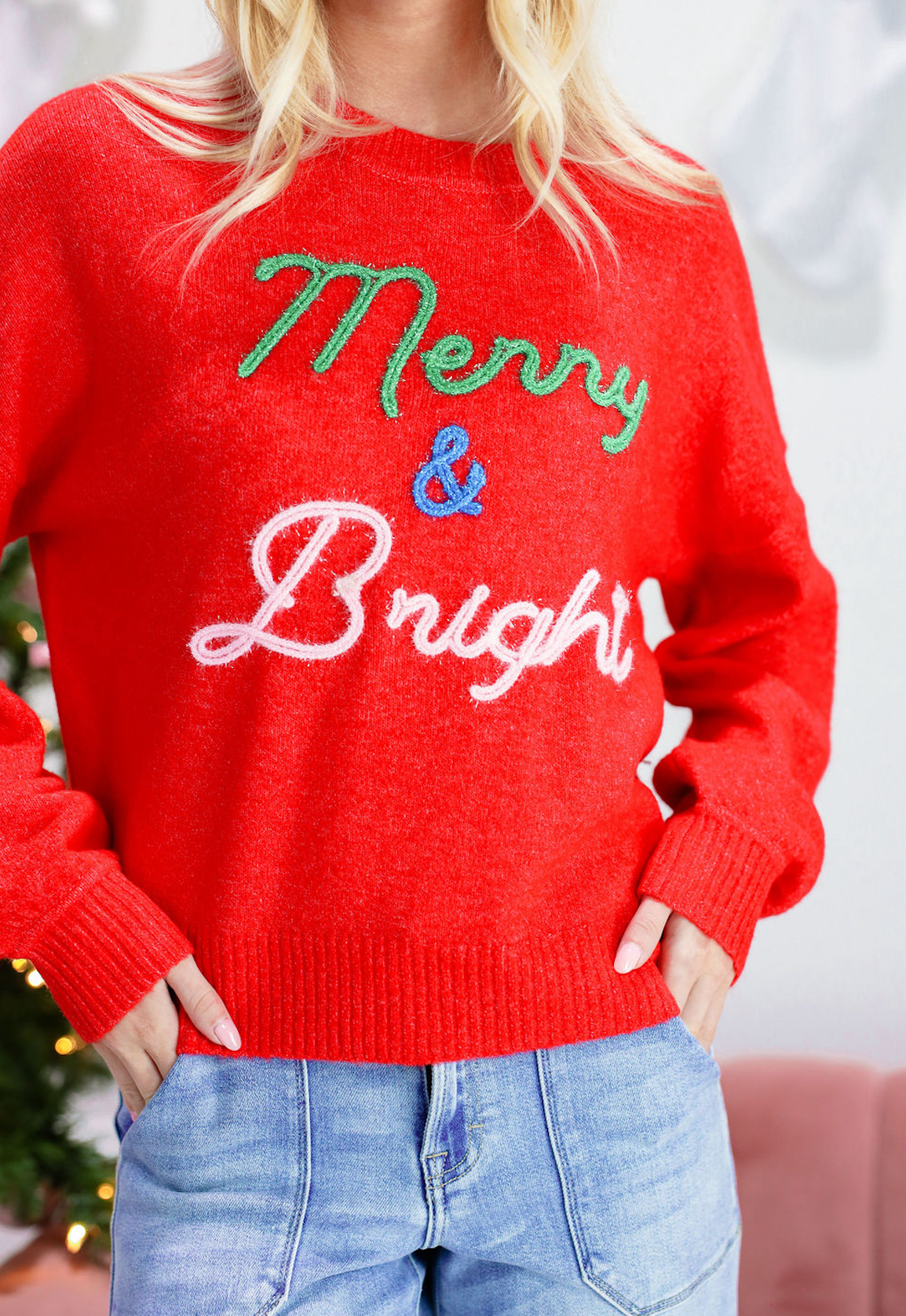 Light up the room in this festive red sweater showcasing colorful lettering that captures the joy of the season. The playful multi-color design brings personality and cheer to your holiday wardrobe. Cozy, fun, and impossible to miss.