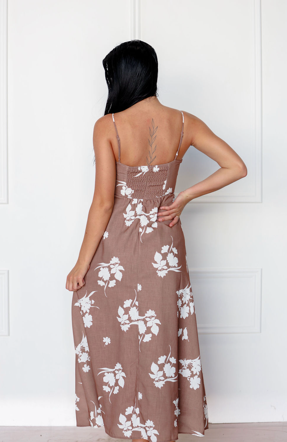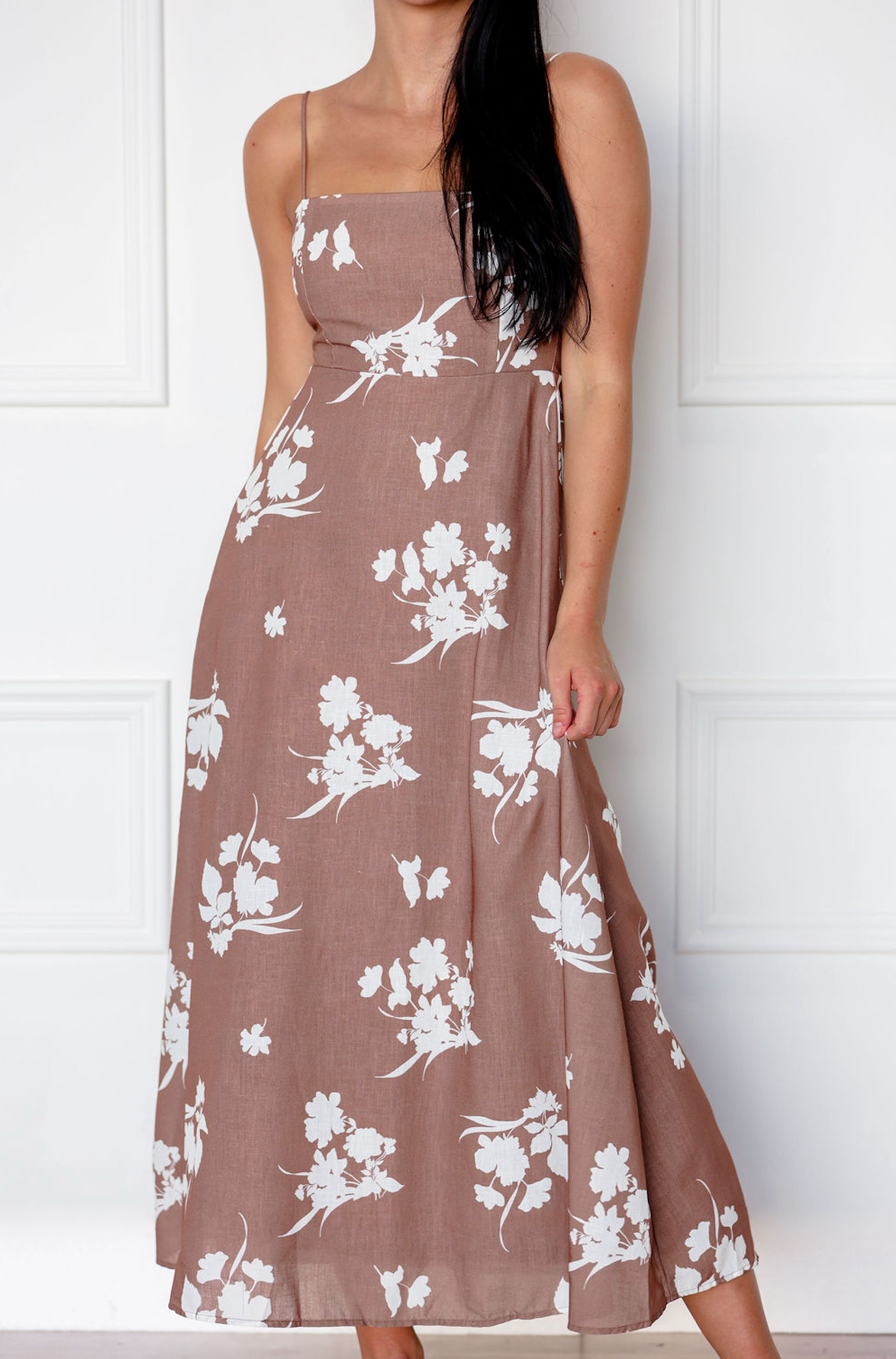 A fall-ready floral midi with delicate spaghetti straps, a flowy silhouette, and effortless charm.
