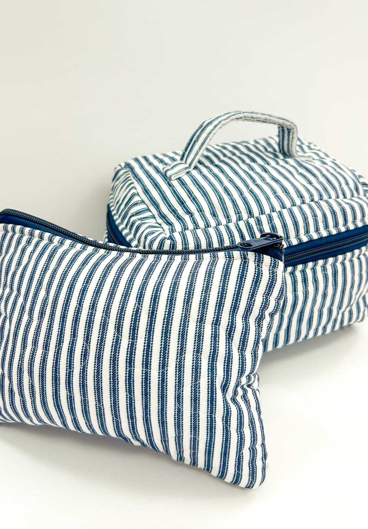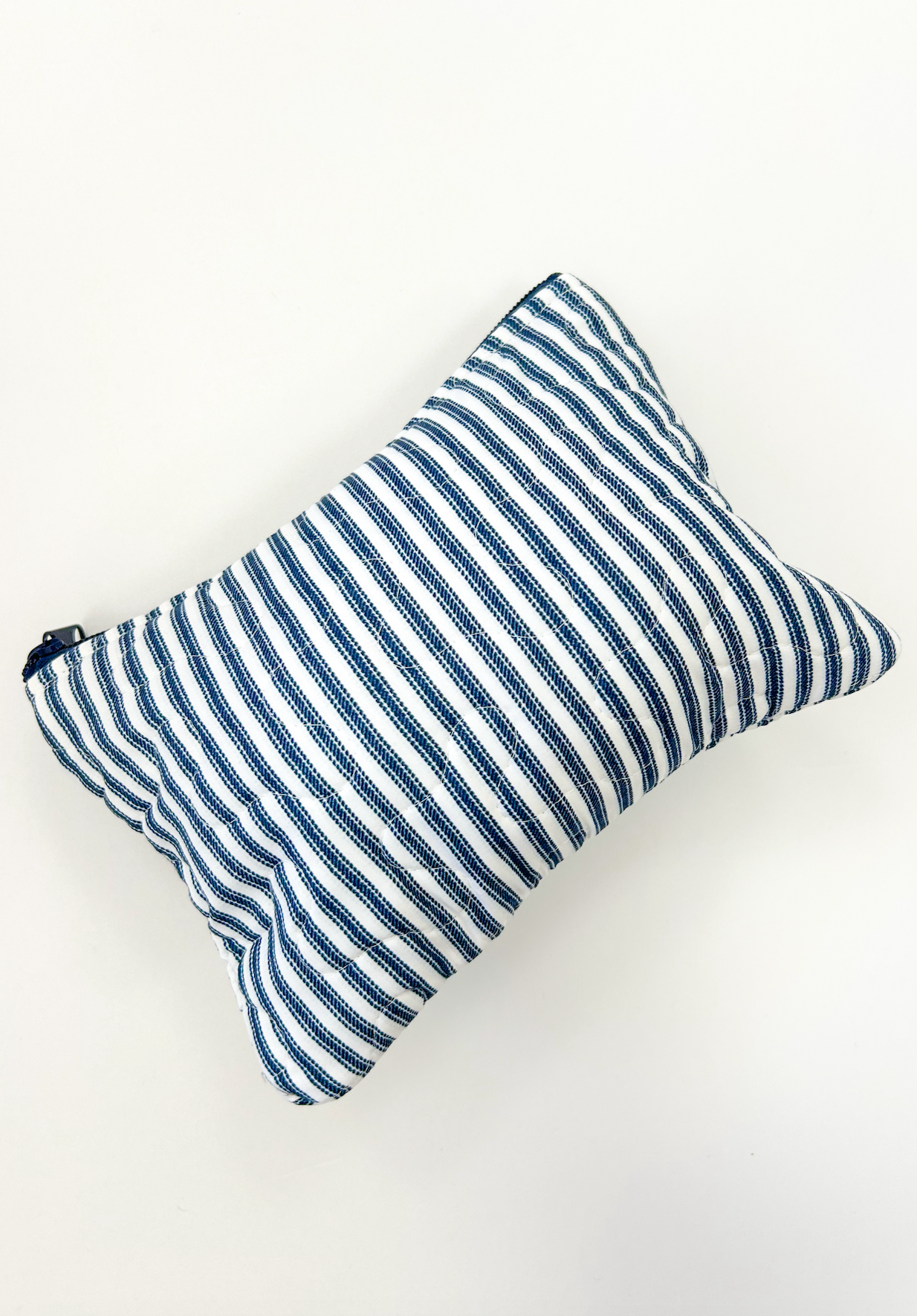 Classic navy stripes on cozy quilted fabric. Sleek, practical, and perfect for storing your daily beauty essentials.