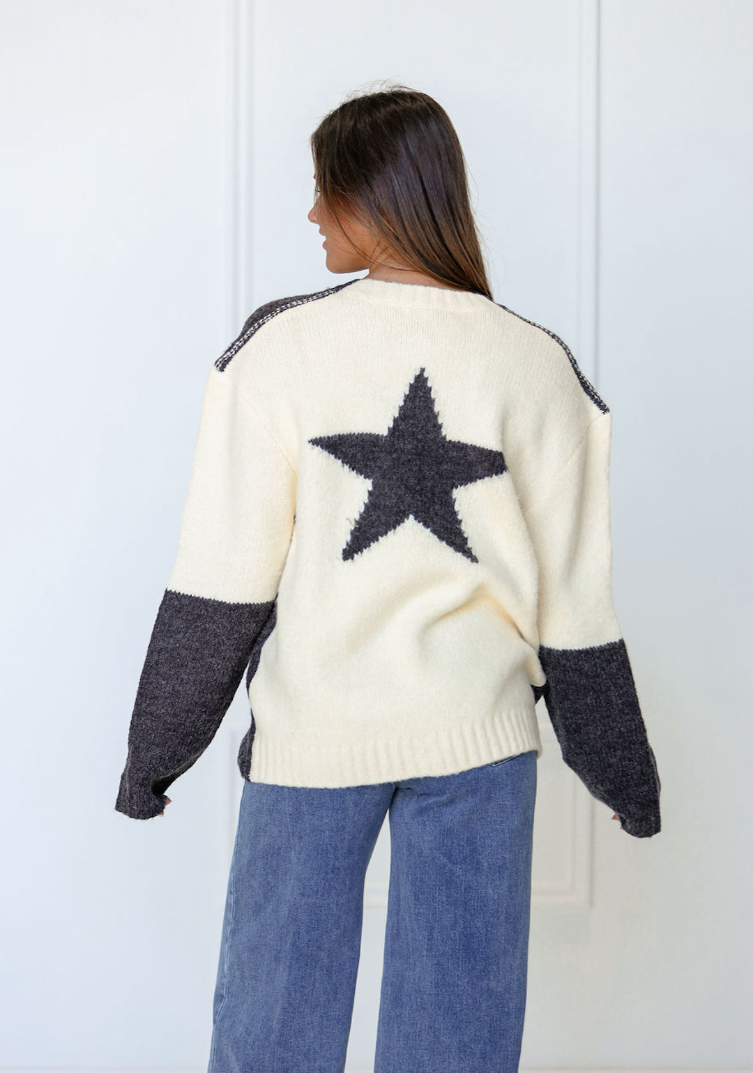 The Oversized Star Sweater features a navy front with cream star, color-blocked cream and navy sleeves, and a cream back with navy star. The relaxed fit is perfect for layering or wearing solo on casual days.
