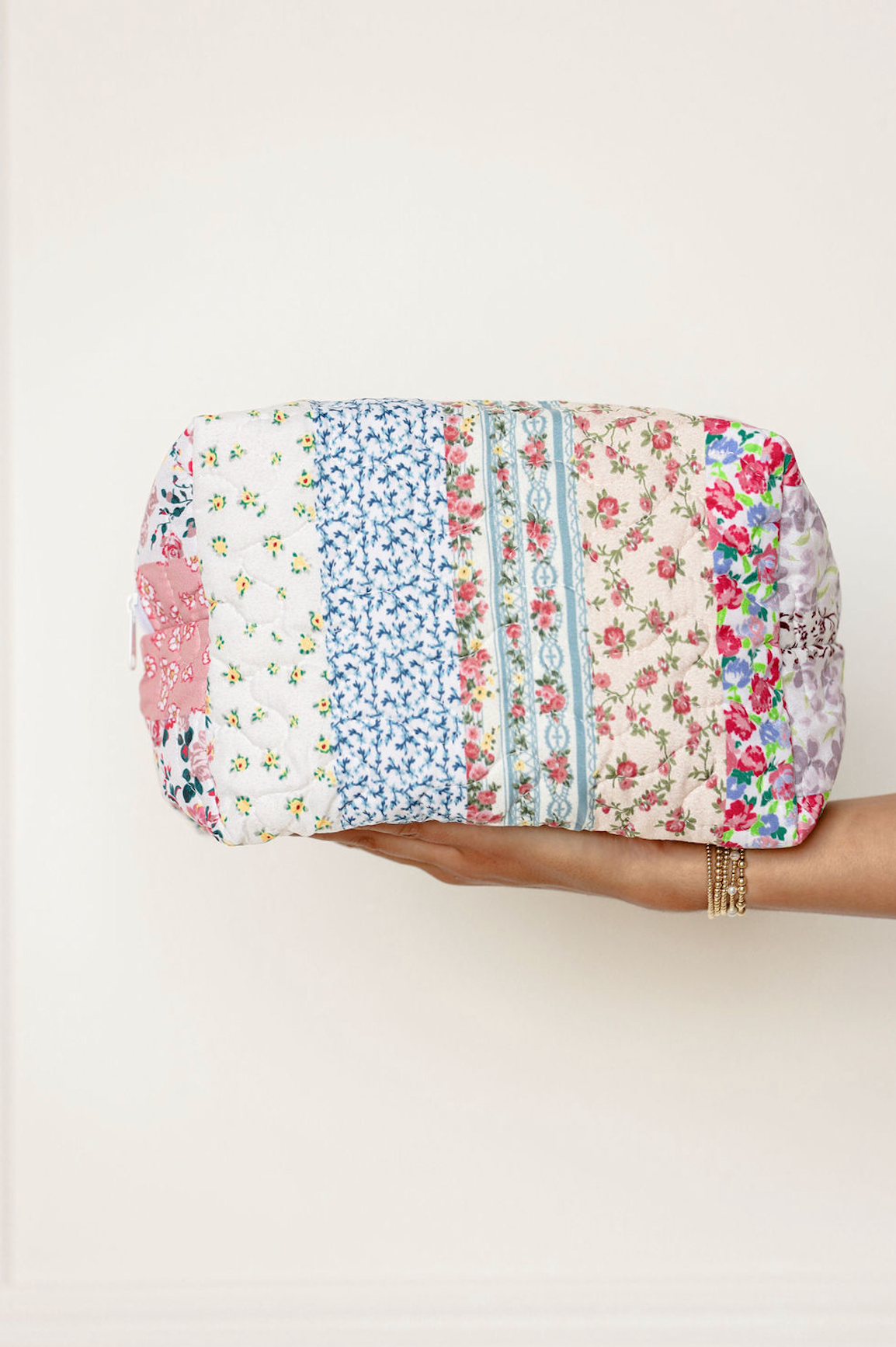 A colorful patchwork of floral prints on soft quilting. Spacious and charming—perfect for organizing all your beauty favorites in style.