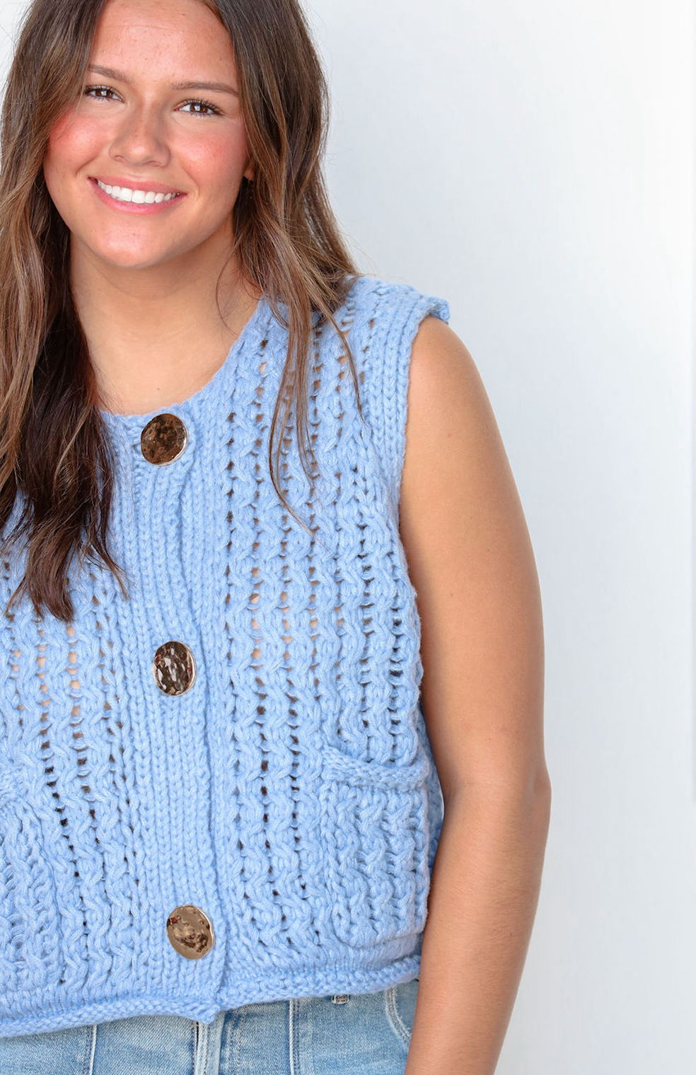 This periwinkle chunky knit vest brings texture and charm with its bold knit pattern and soft, cozy feel. The relaxed fit and vibrant hue make it a standout layering piece for cooler days.