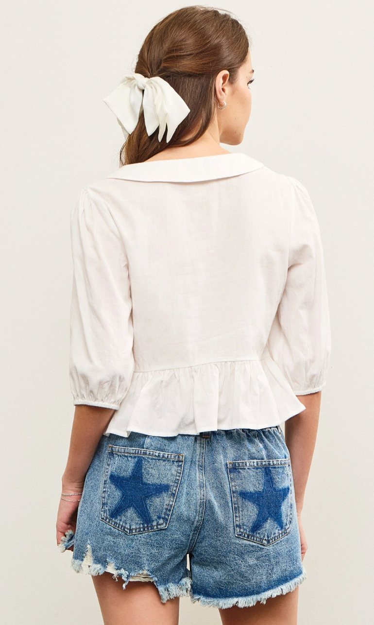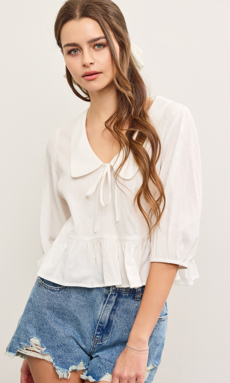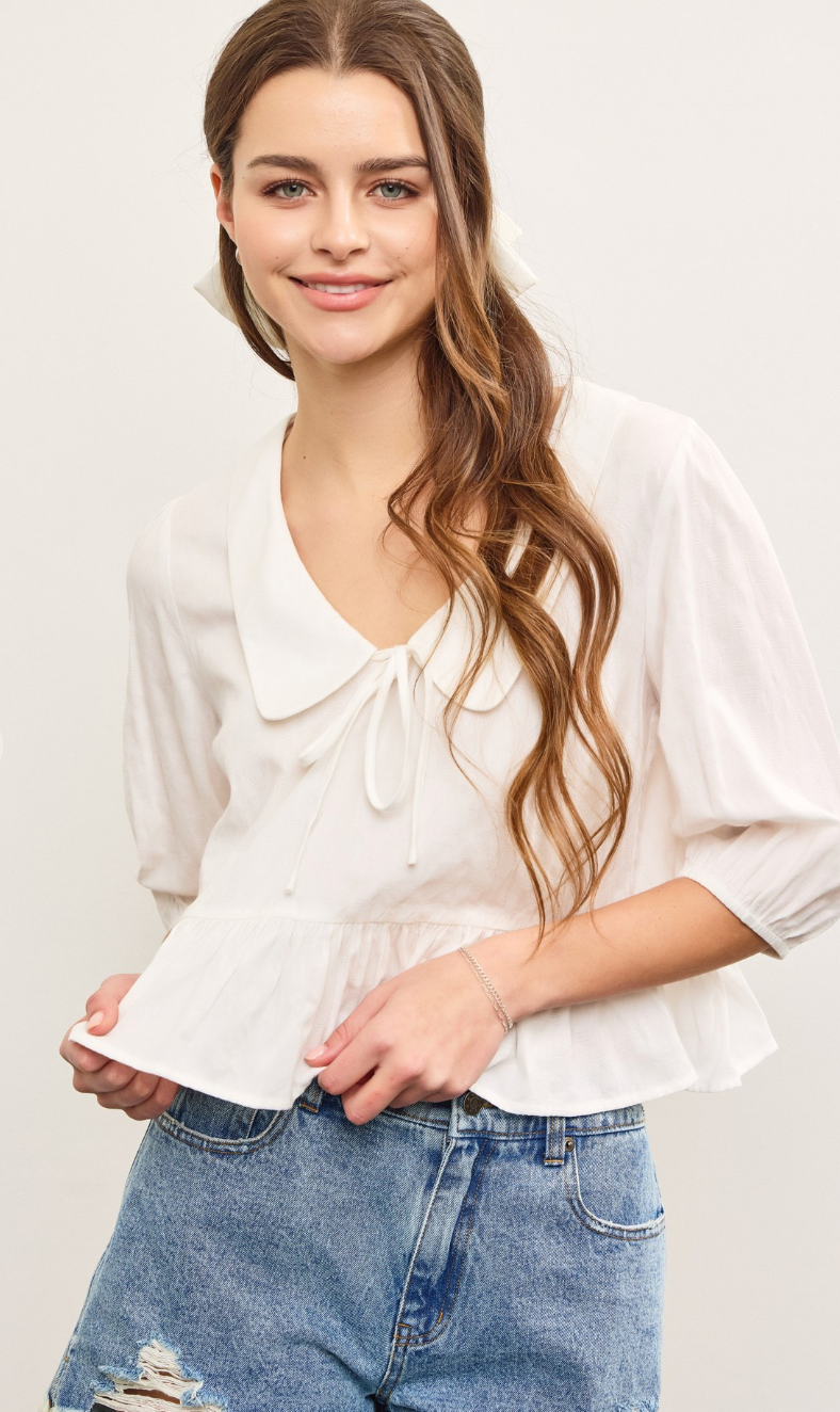 A staple piece that is on trend! The Peter Pan Collar Blouse has the collar detail that we love with a half sleeve! Pair it with denim and sandals for a casual look!