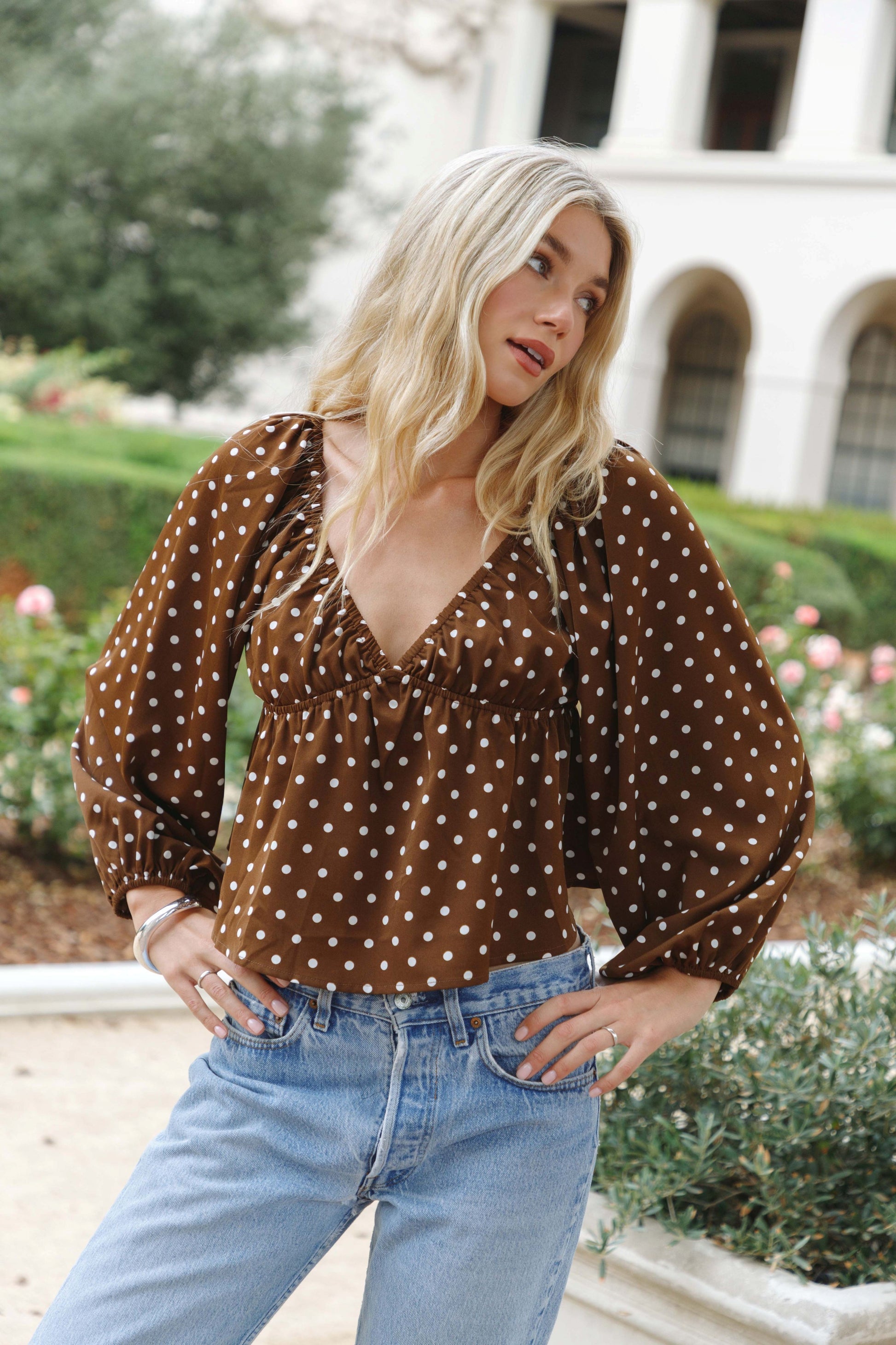 Elevate your everyday wardrobe with this charming brown polka dot top. The flattering v-neck neckline and blouson sleeves create a feminine silhouette that works beautifully for both casual outings and office settings. Soft, breathable fabric ensures all-day comfort, while the classic polka dot pattern adds a timeless touch of style.
