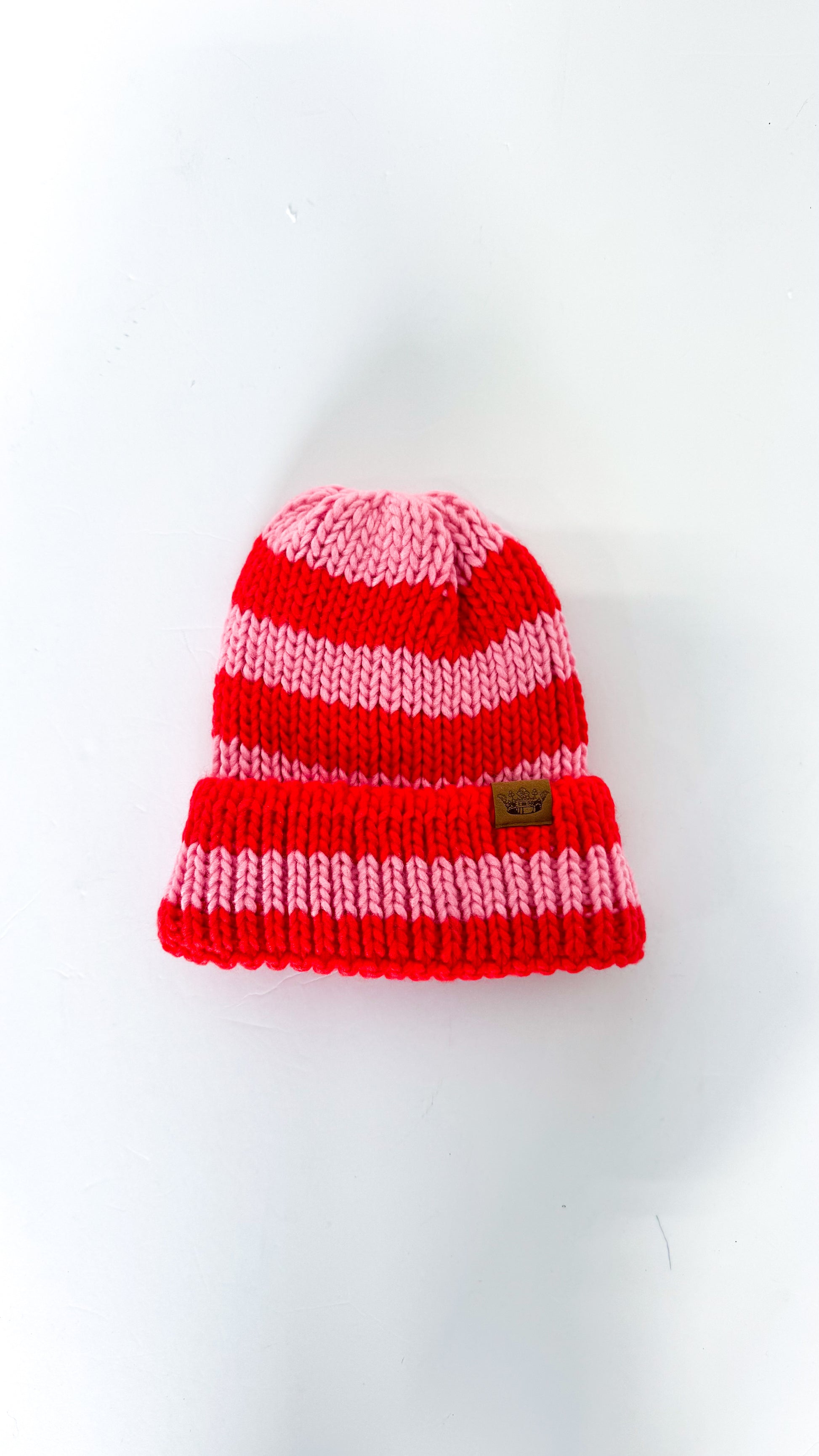 Stay warm and stylish with this red and blush striped knit beanie. Featuring soft, cozy fabric and a playful color combo, it's the perfect finishing touch for your cold-weather outfits.