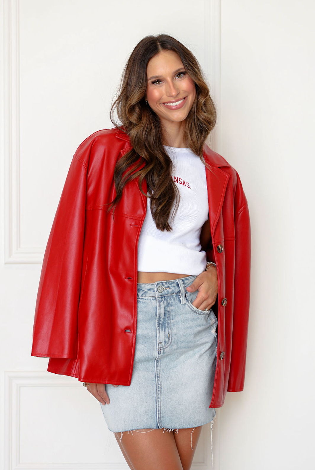 Make a bold entrance in the Red Faux Leather Jacket. With its high-shine finish, structured fit, and snap-button front, this statement layer adds instant edge to any outfit.