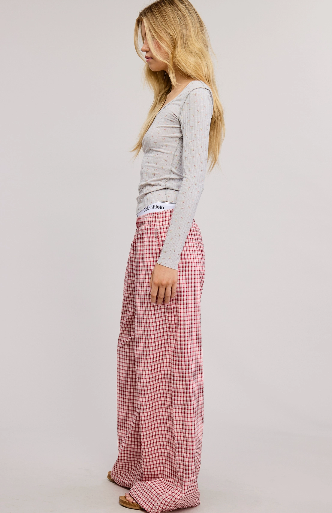 Red low-rise plaid boxer-style pants with a relaxed wide-leg fit and elastic waistband.
