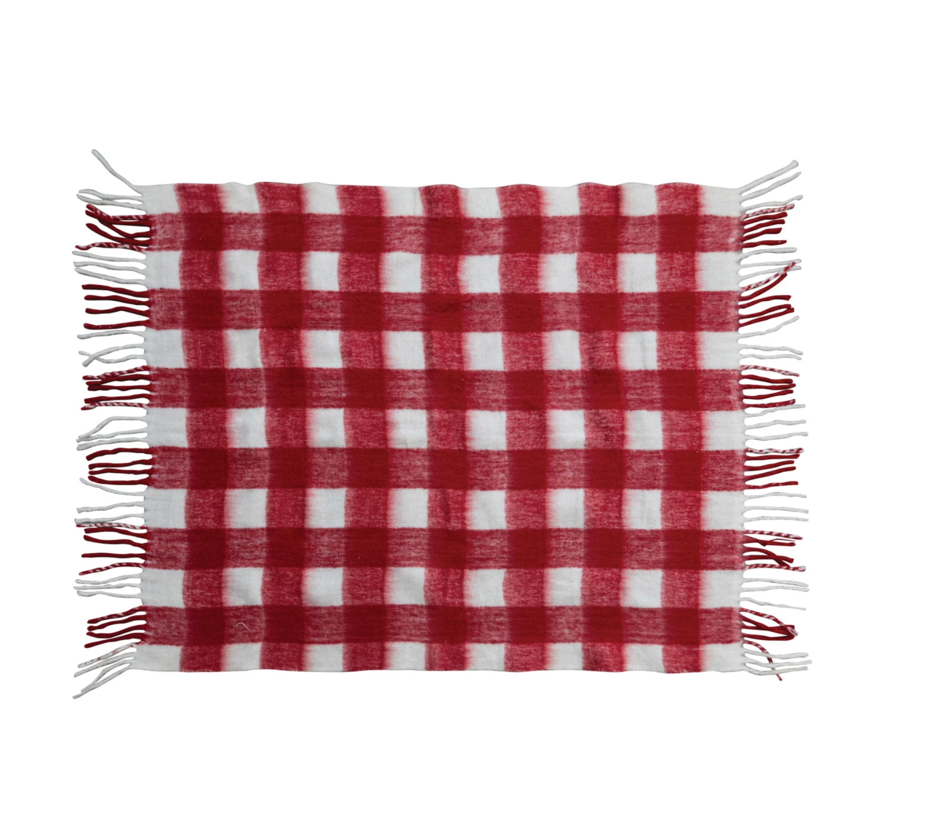 60"L x 50"W Woven Acrylic Throw w/ Fringe, Red & White Plaid