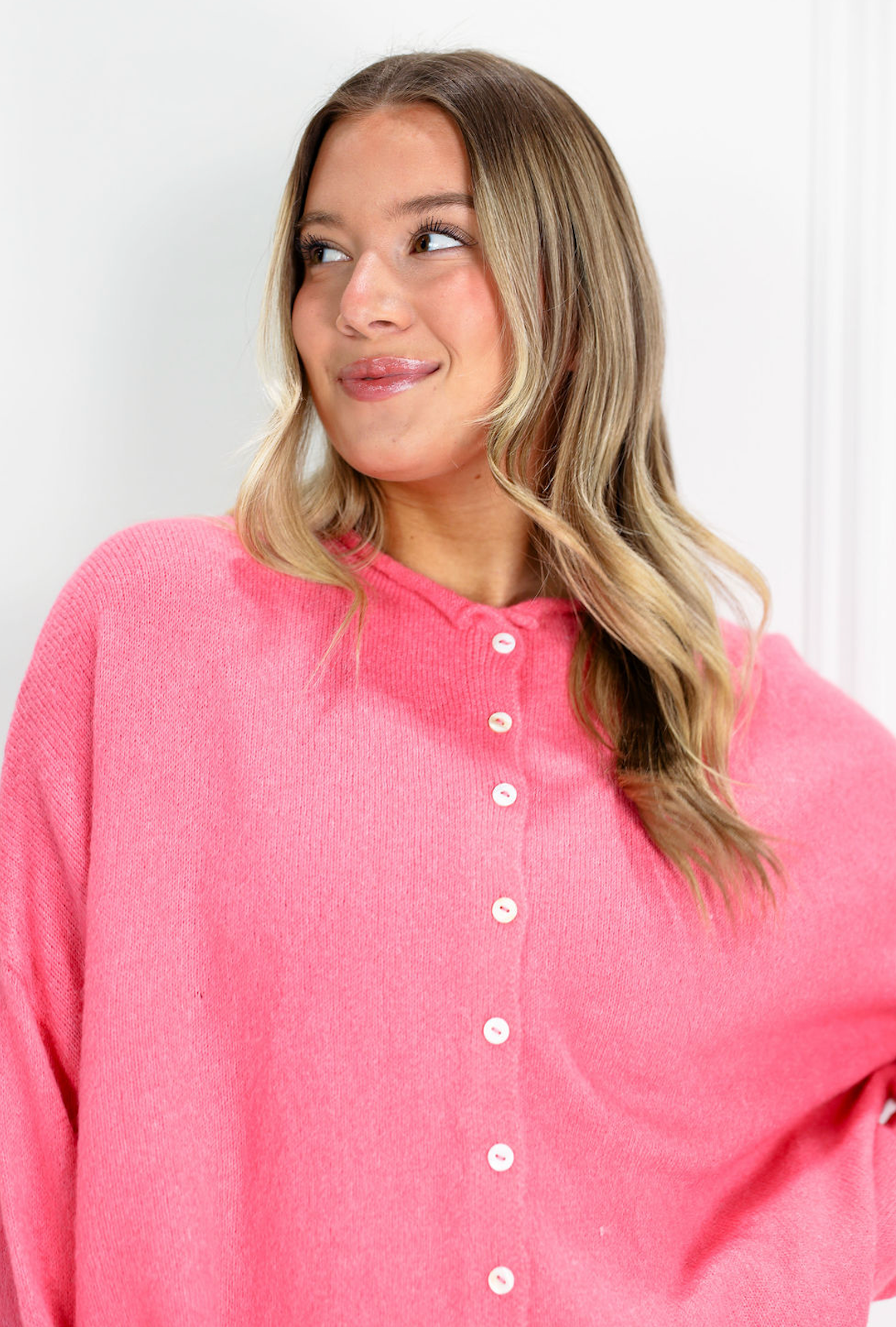 The Rose Button Up Sweater is soft, sweet, and endlessly wearable. With its relaxed fit, pearl-style buttons, and cozy knit feel, it's a feminine layer made for easy days.