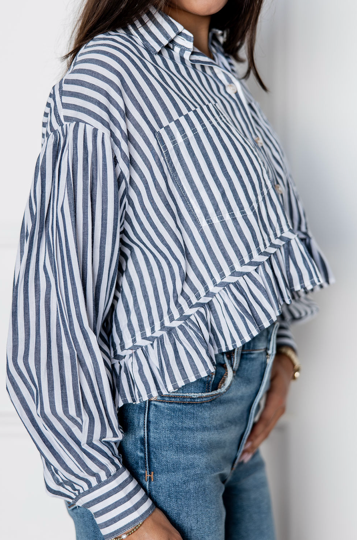 Navy and white stripe shirt with a button front, classic collar, and playful ruffle hem for a feminine twist on a tailored style.