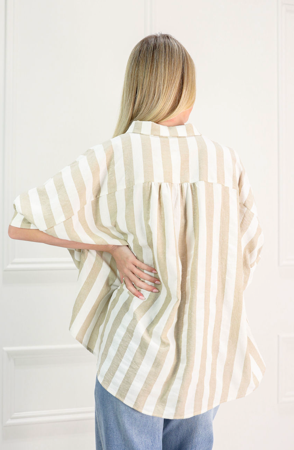 Make a statement with this sand striped button-down! The oversized cut delivers effortless style—perfect for layering or wearing solo. Crisp stripes and classic button detailing create a timeless piece that works for casual days or dressed-up occasions. Versatile, comfortable, and undeniably chic.