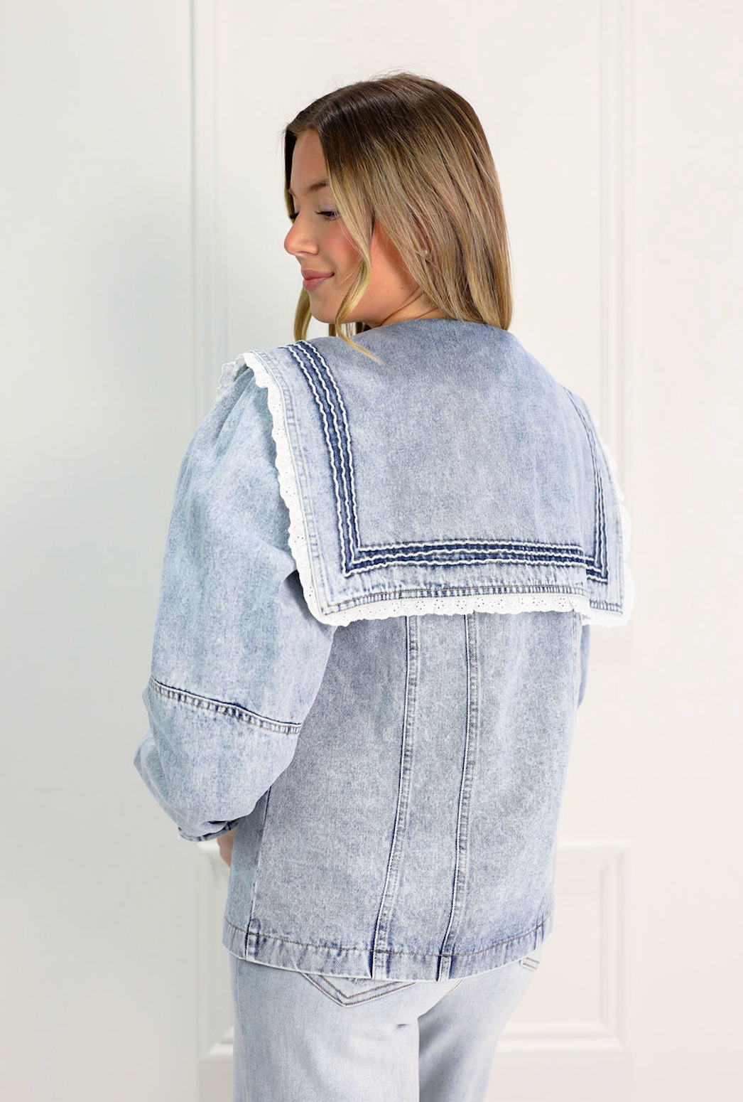 Meet your new go-to layer. This denim jacket features charming eyelet details and a classic collared design that elevates any outfit. Durable and timeless, it's the perfect piece for transitional weather or throwing over your favorite dress. Style it your way—casual or dressed up.